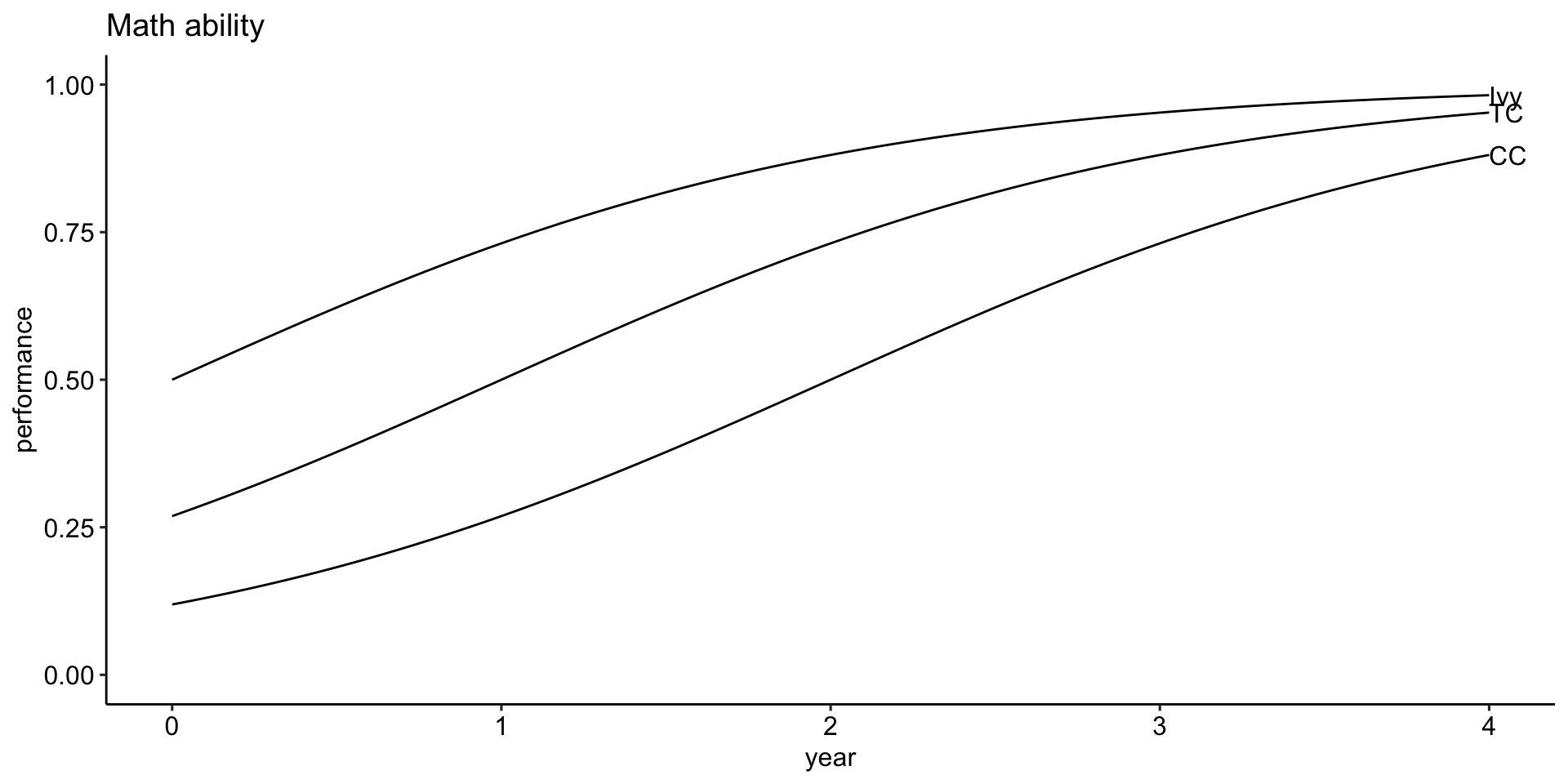 \[prob(correct|\theta,\delta) = \frac{1}{1+e^{\delta-\theta}}\]