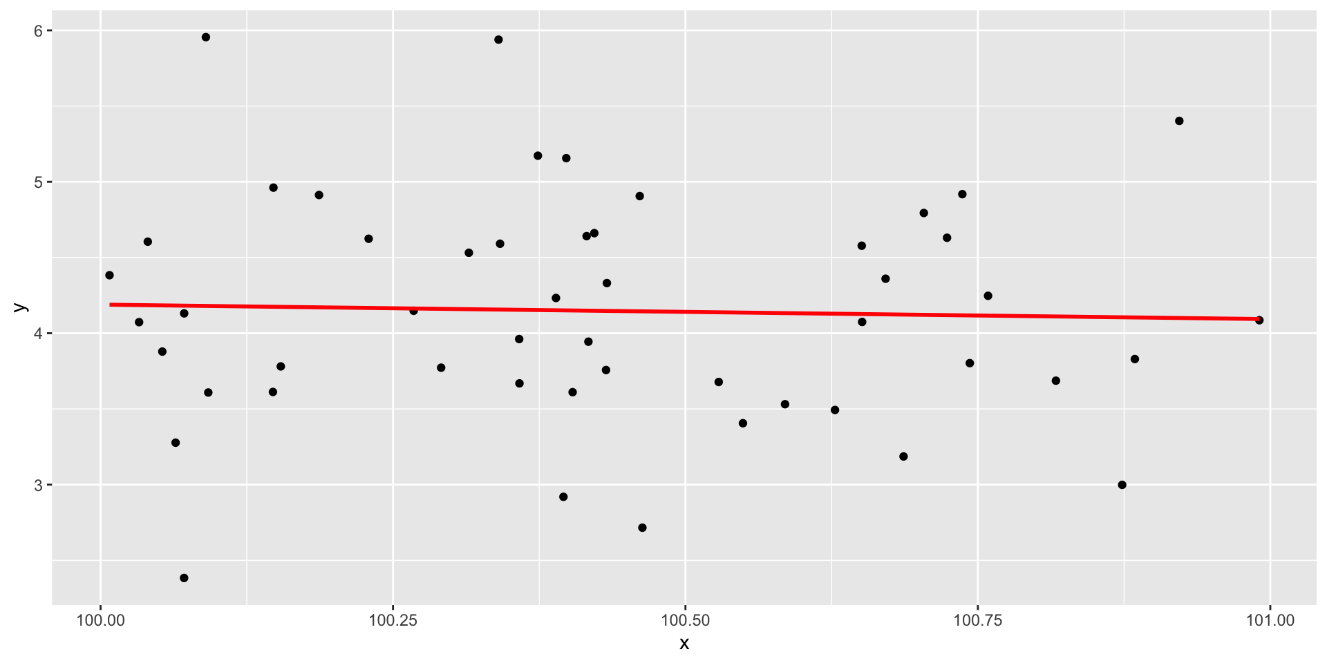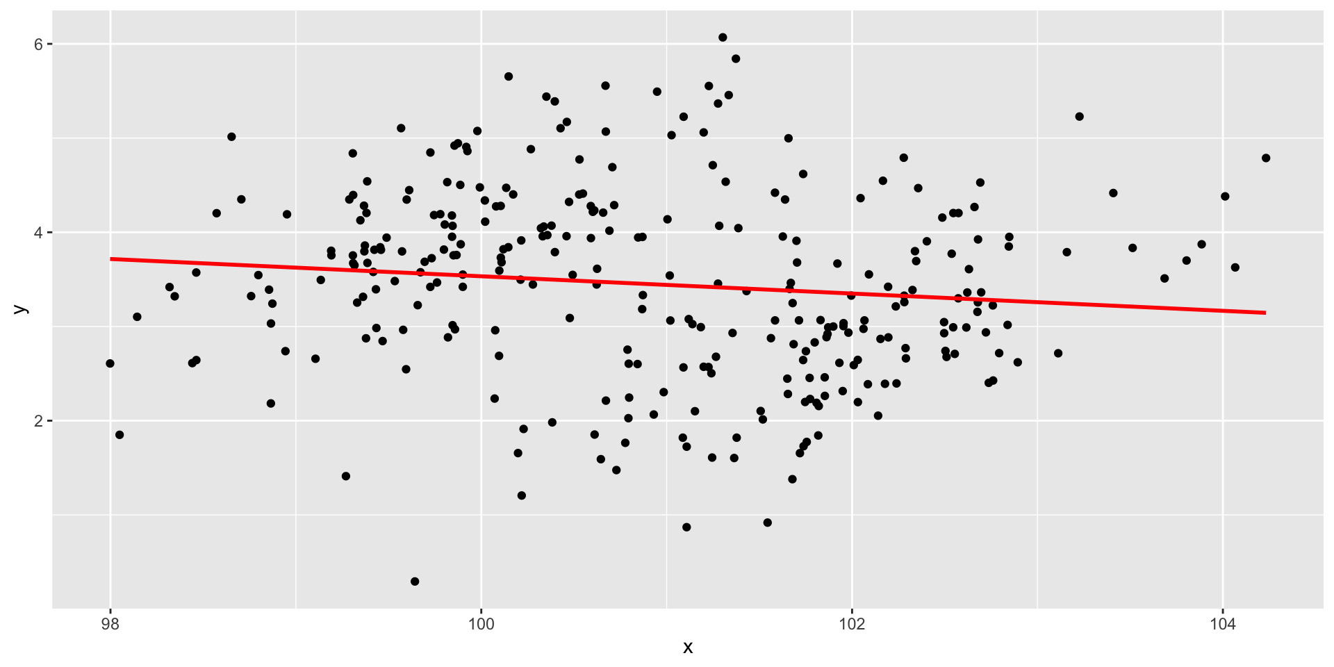 data %>%ggplot(aes(x=x, y=y)) +geom_point() +geom_smooth(method ="lm", se =FALSE, color ="red")