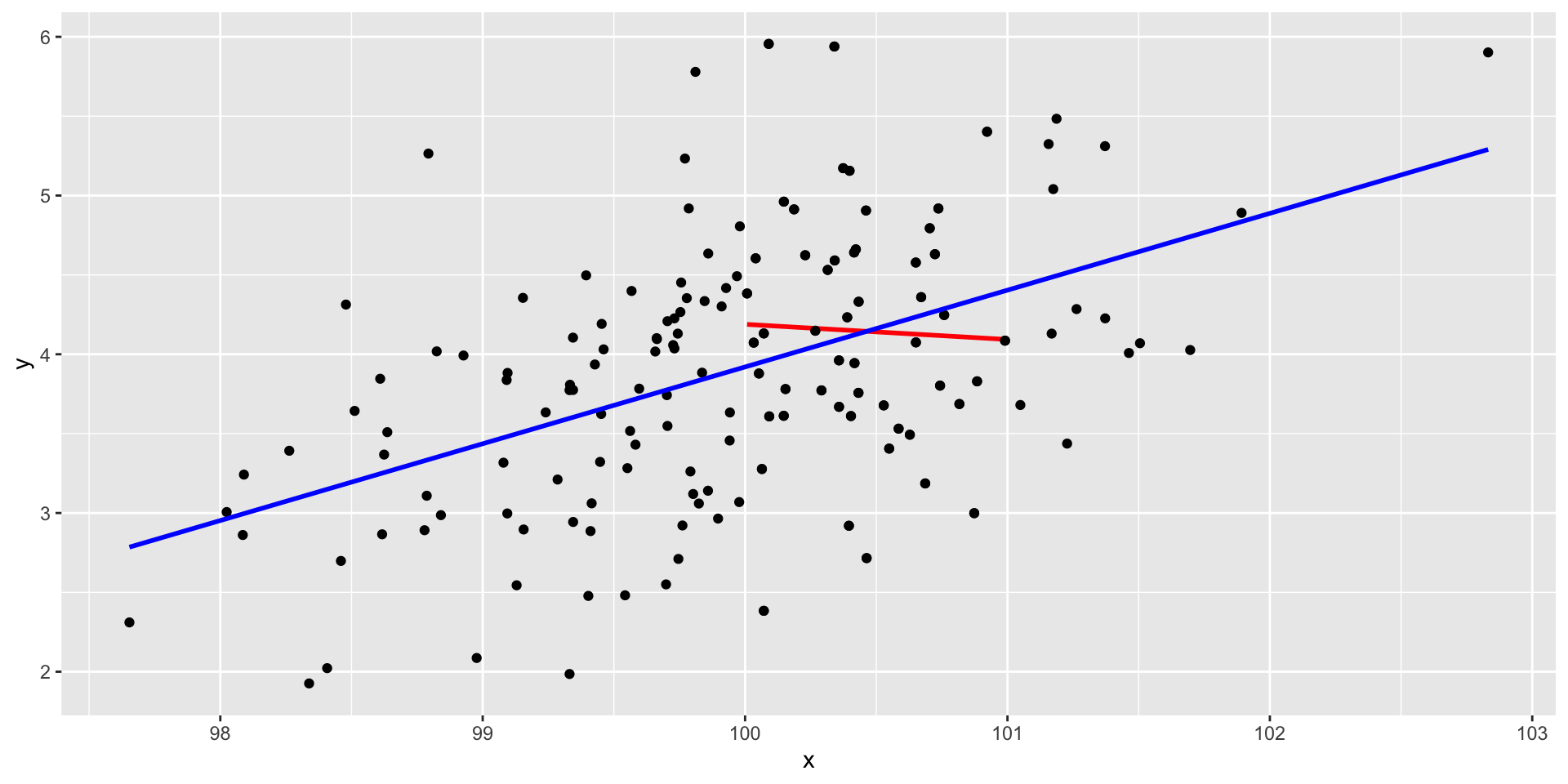 data %>%ggplot(aes(x=x, y=y)) +geom_point() +geom_smooth(method ="lm", se =FALSE, color ="red") +geom_point(data = real_data) +geom_smooth(method ="lm", se =FALSE, data = real_data, color ="blue")