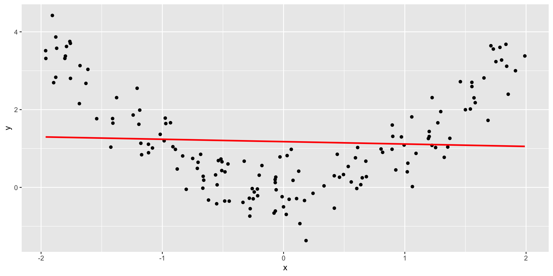 x =runif(n =150, min =-2, max =2)y = x^2+rnorm(n =150, sd = .5)data =data.frame(x,y)