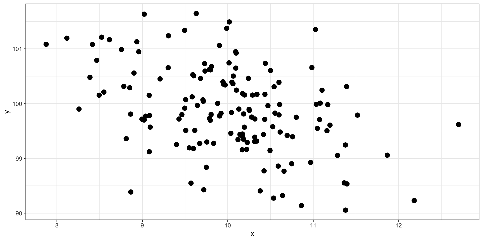 set.seed(101019) # so we all get the same random numbersmu =c(10, 100)Sigma =matrix(c(.8, -.3, -.3, .7), ncol =2) #diagonals are reliabilites, off-diagonals are correlationsdata =mvrnorm(n =150, mu = mu, Sigma = Sigma)data =as.data.frame(data)colnames(data) =c("x", "y")data %>%ggplot(aes(x = x, y = y)) +geom_point(size =3) +theme_bw()