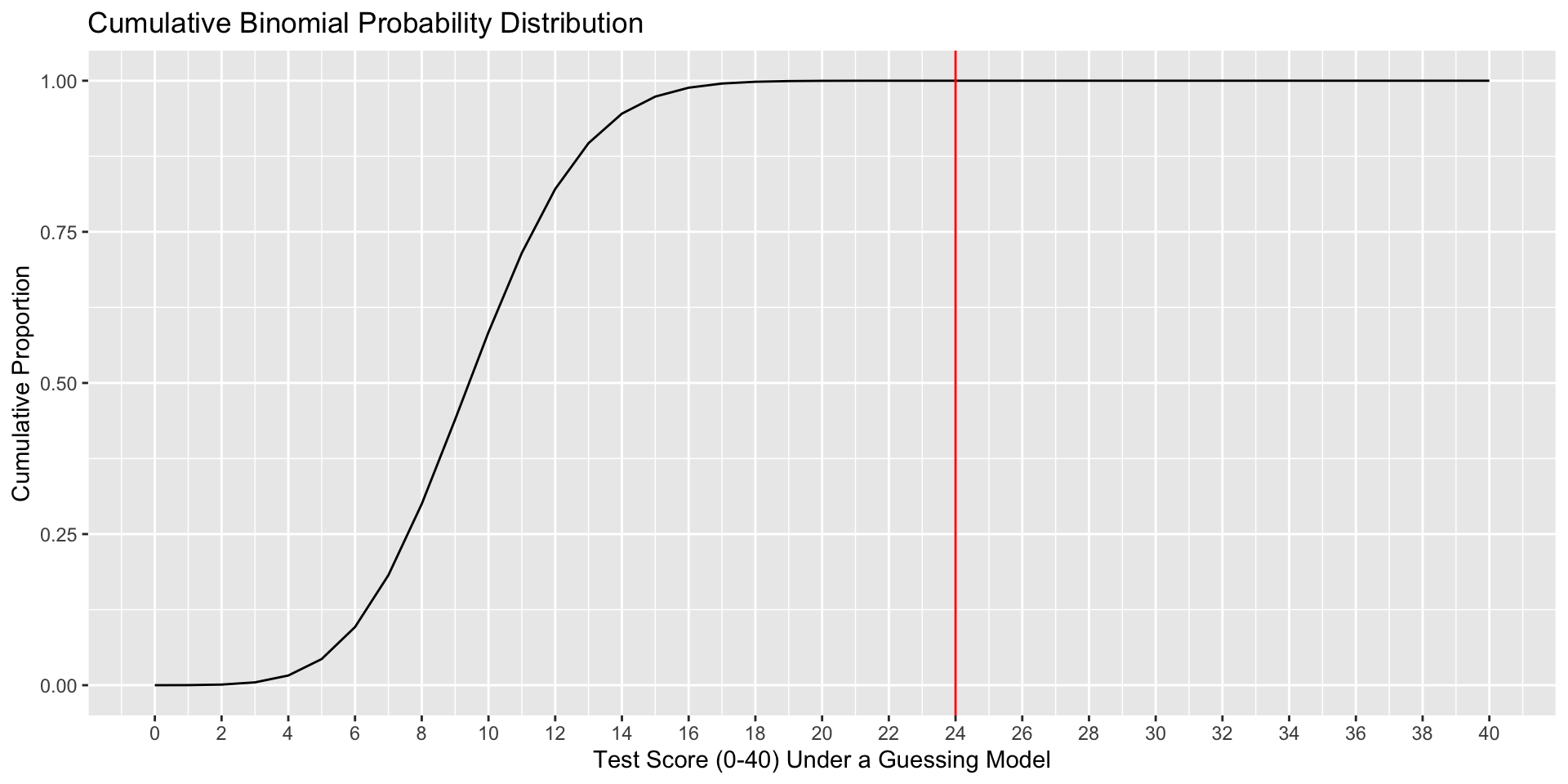 How likely is it that a guesser would score above the threshold (60%) necessary to pass the class by the most minimal standards?