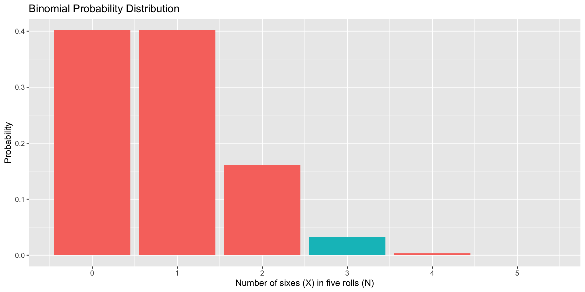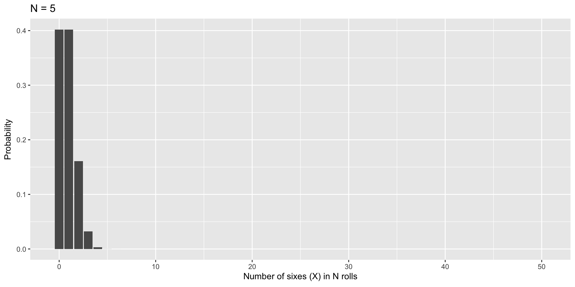data.frame(num = 0:5, p = dbinom(x = 0:5, size = 5, prob = 1/6), three = as.factor(c(0,0,0,1,0,0))) %>% ggplot(aes(x=num, y=p, fill = three)) + geom_bar(stat="identity") + scale_x_continuous("Number of sixes (X) in five rolls (N)", breaks=c(0:5)) +scale_y_continuous("Probability")+ guides(fill = "none") + ggtitle("Binomial Probability Distribution")Every probability distribution has an expected value distribution.