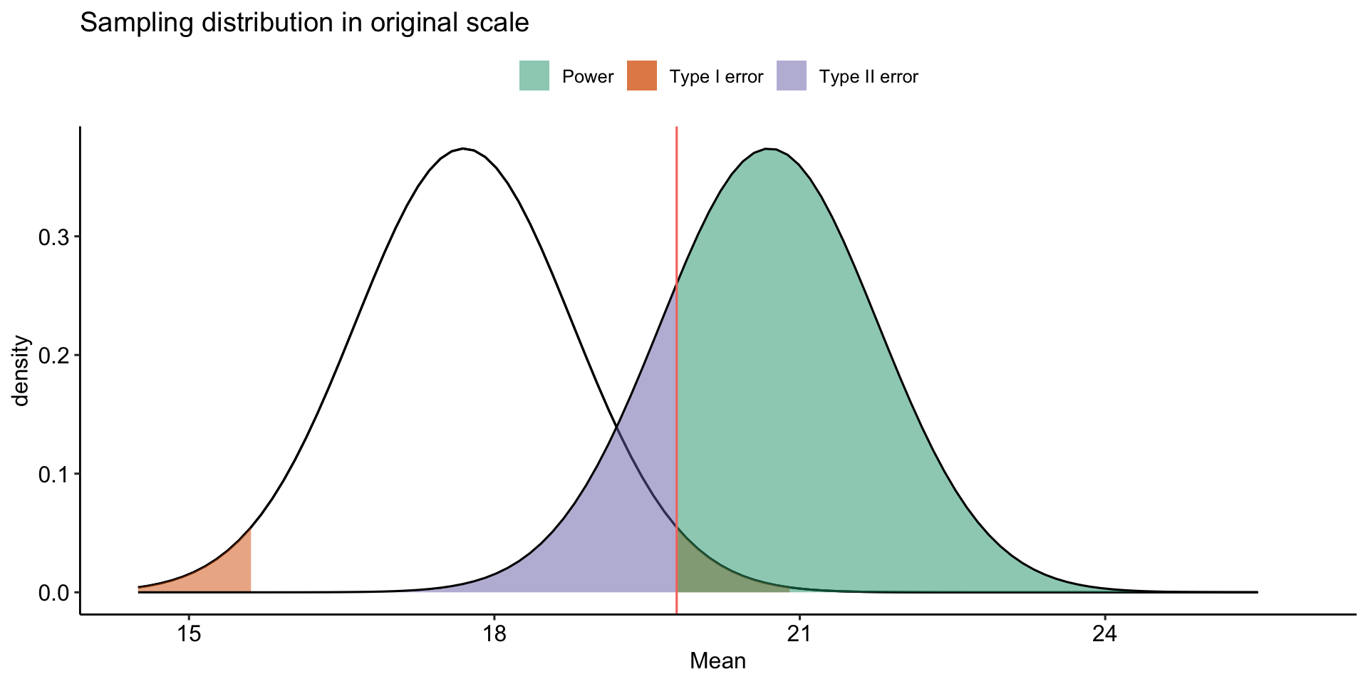 stat_function(aes(fill = "Type I error"), fun = function(x) dnorm(x, mean = mu, sd = sem),