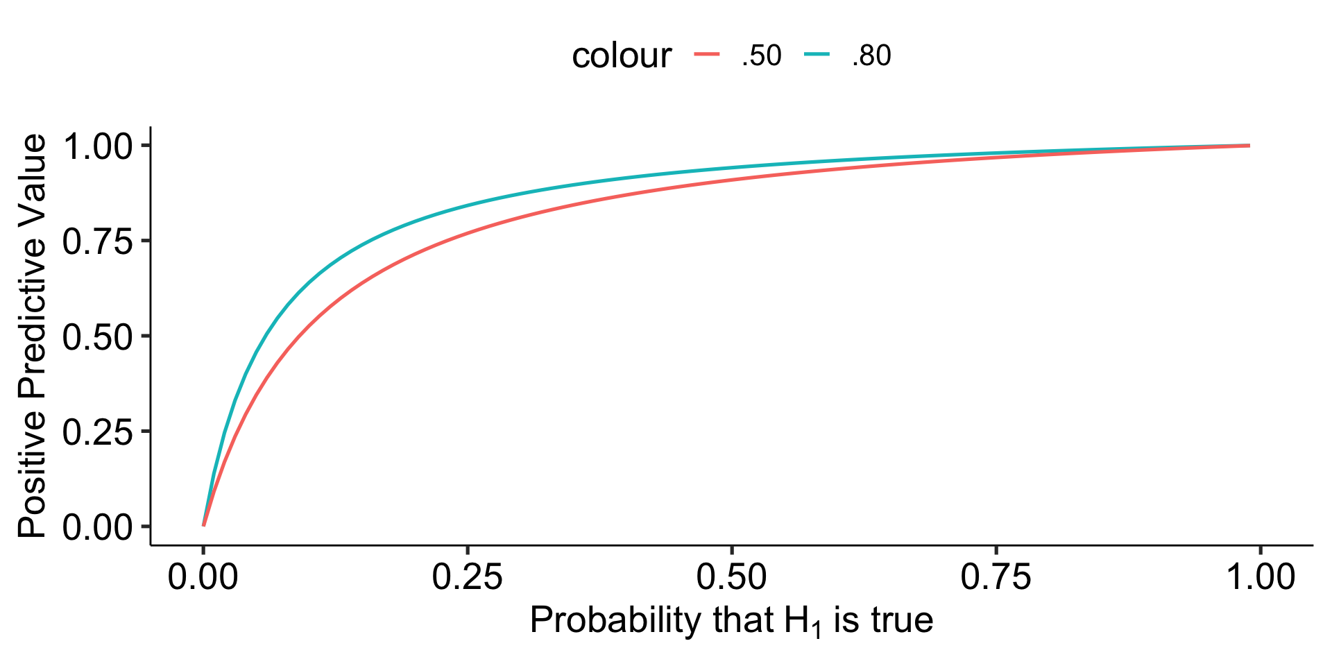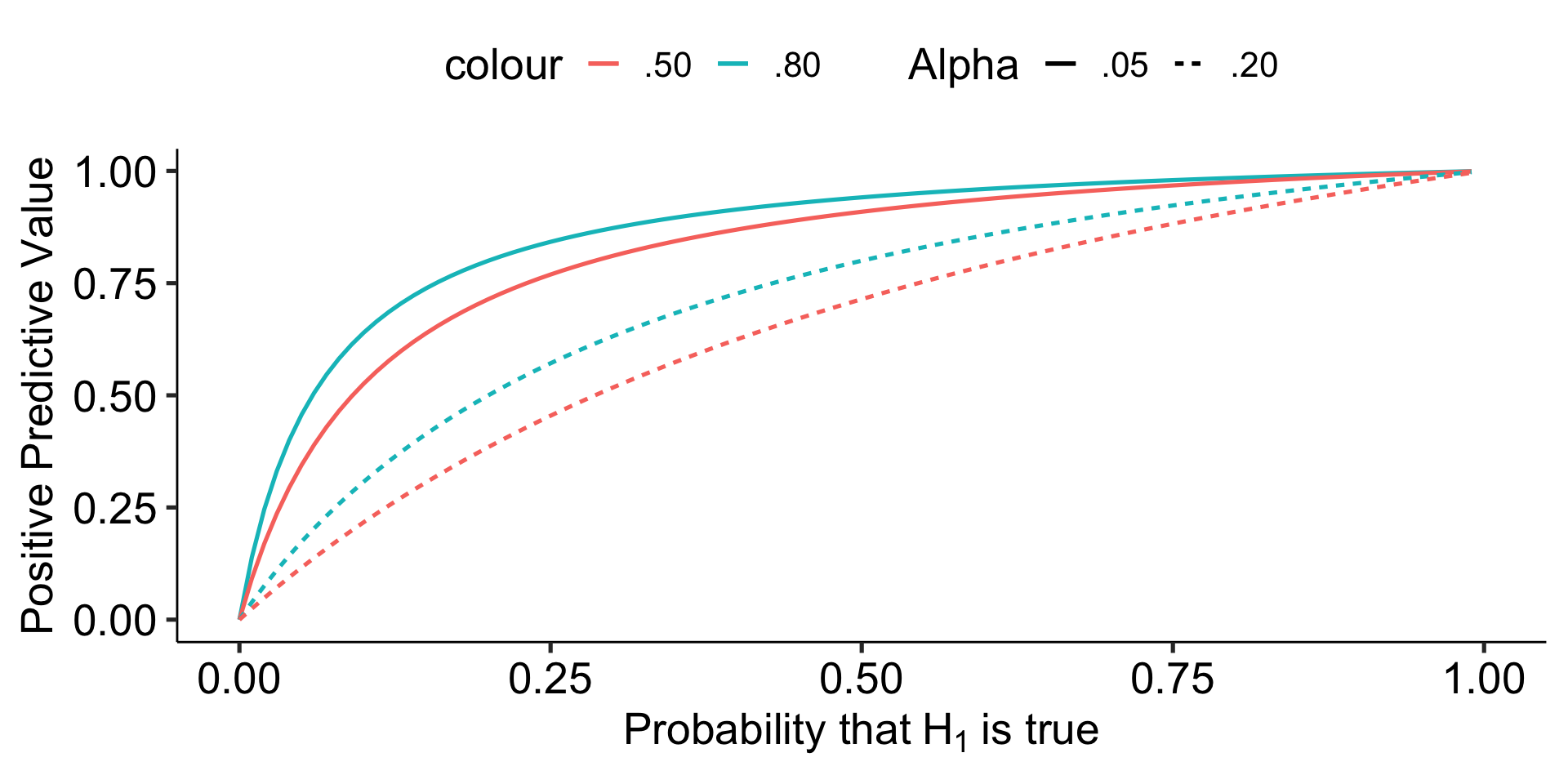 Let’s make some assumptions. If psychology studies use \(\alpha = .05\) and are good at achieving adequate power ( \(1-\beta = .80\) ), how does the choice of hypothesis affect PPV?