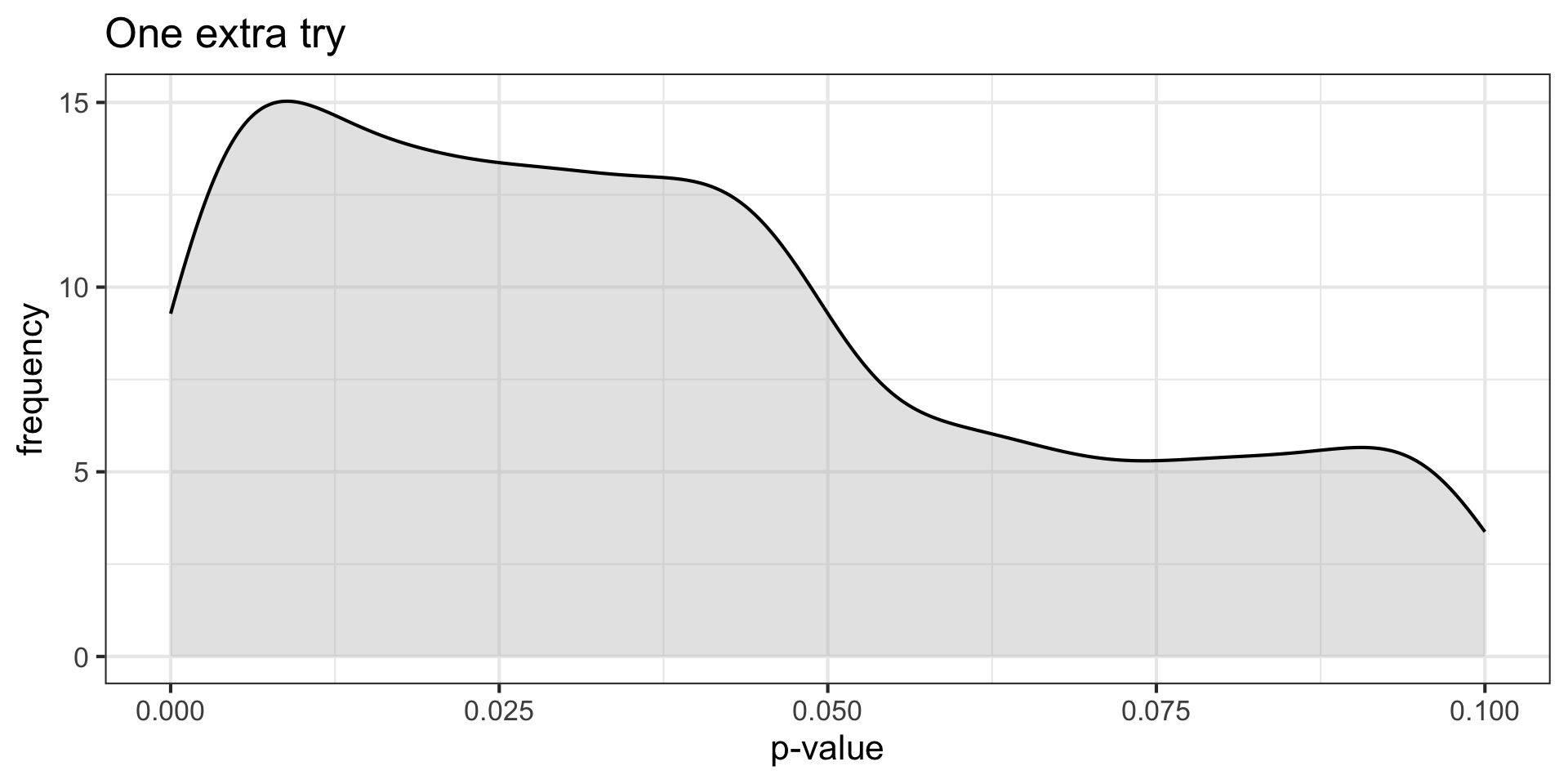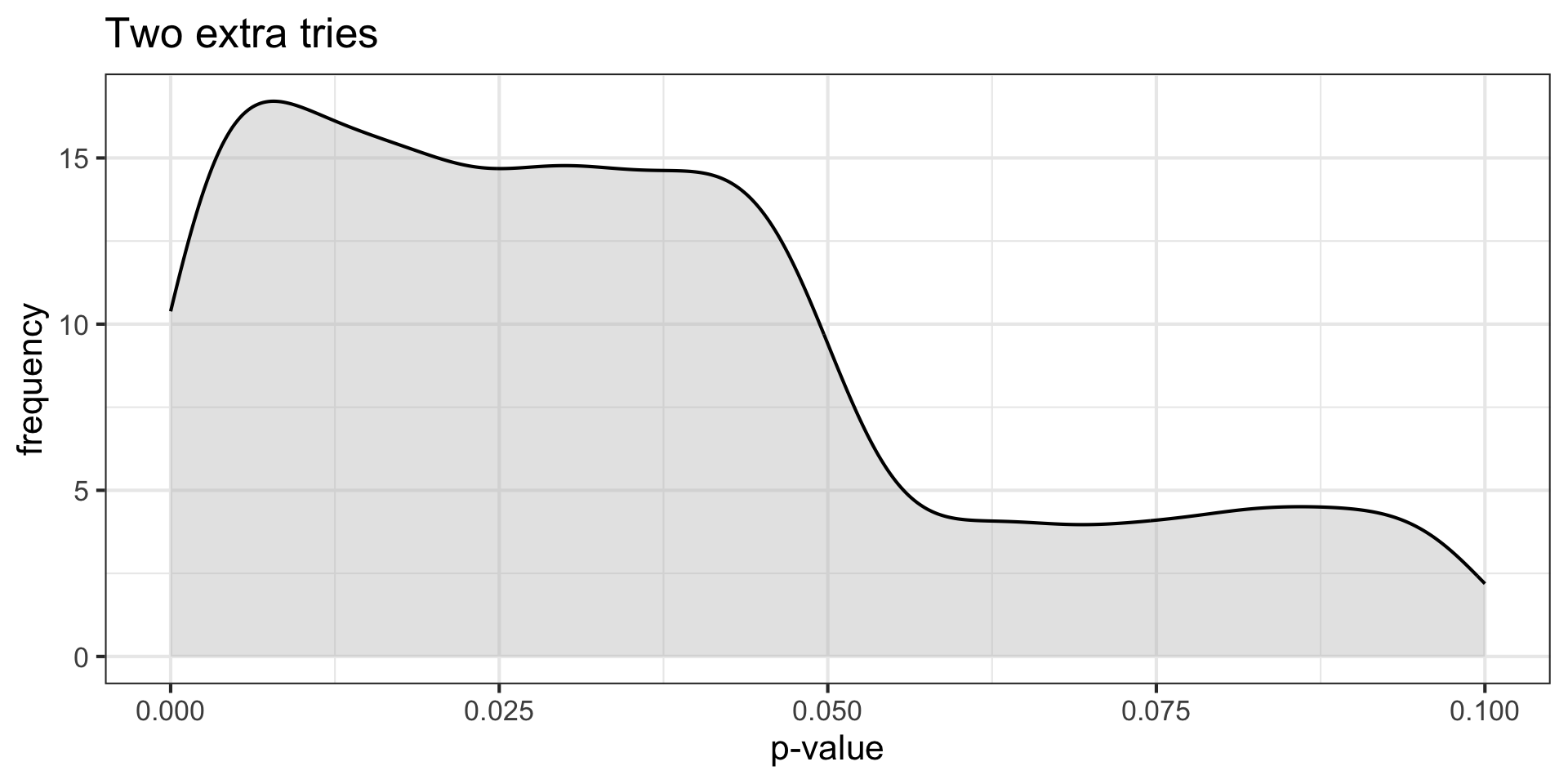 title = "Two extra tries")p-curve made it clear that if our null hypotheses were indeed false, we would most often see very small p-values.
