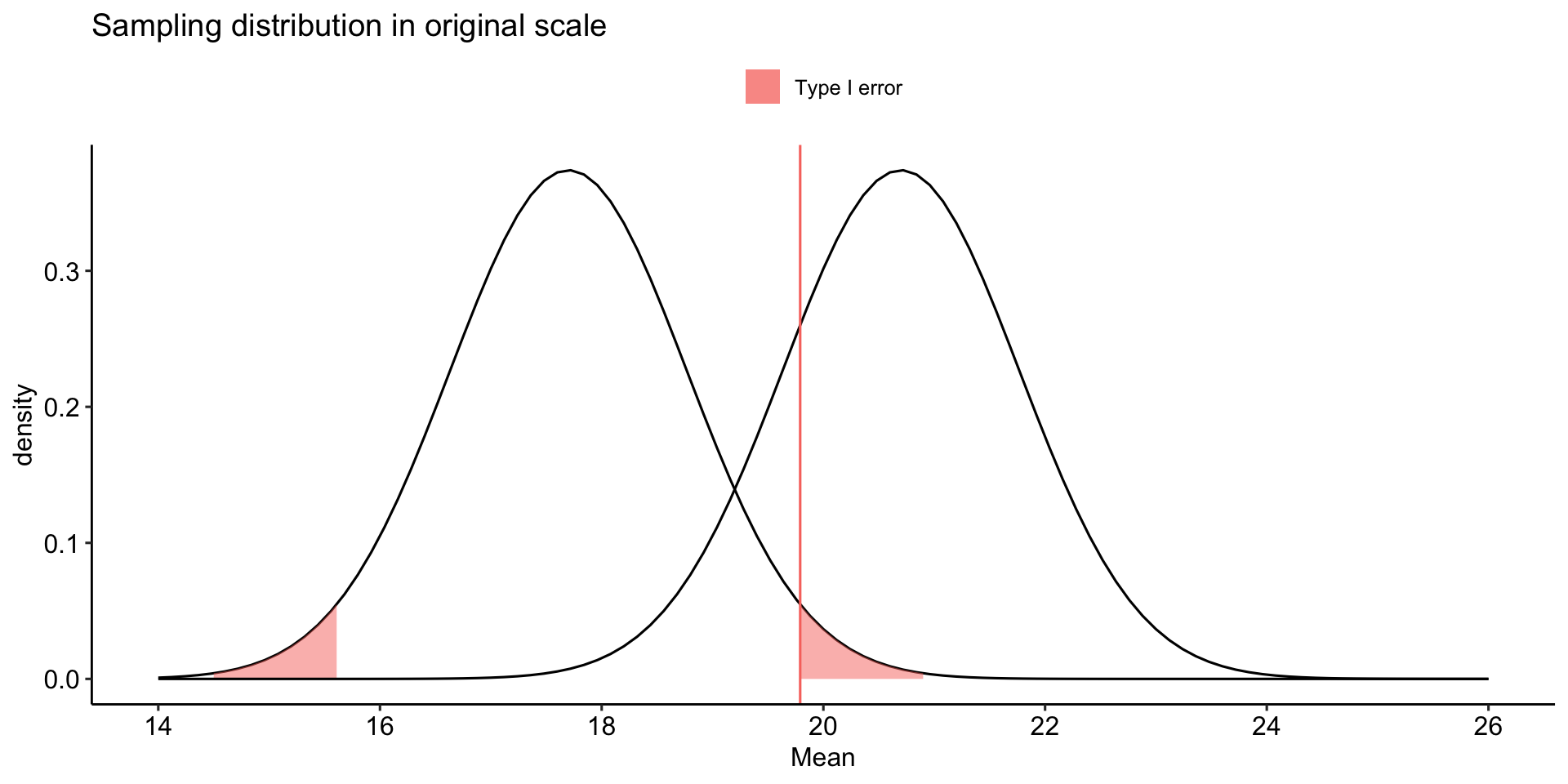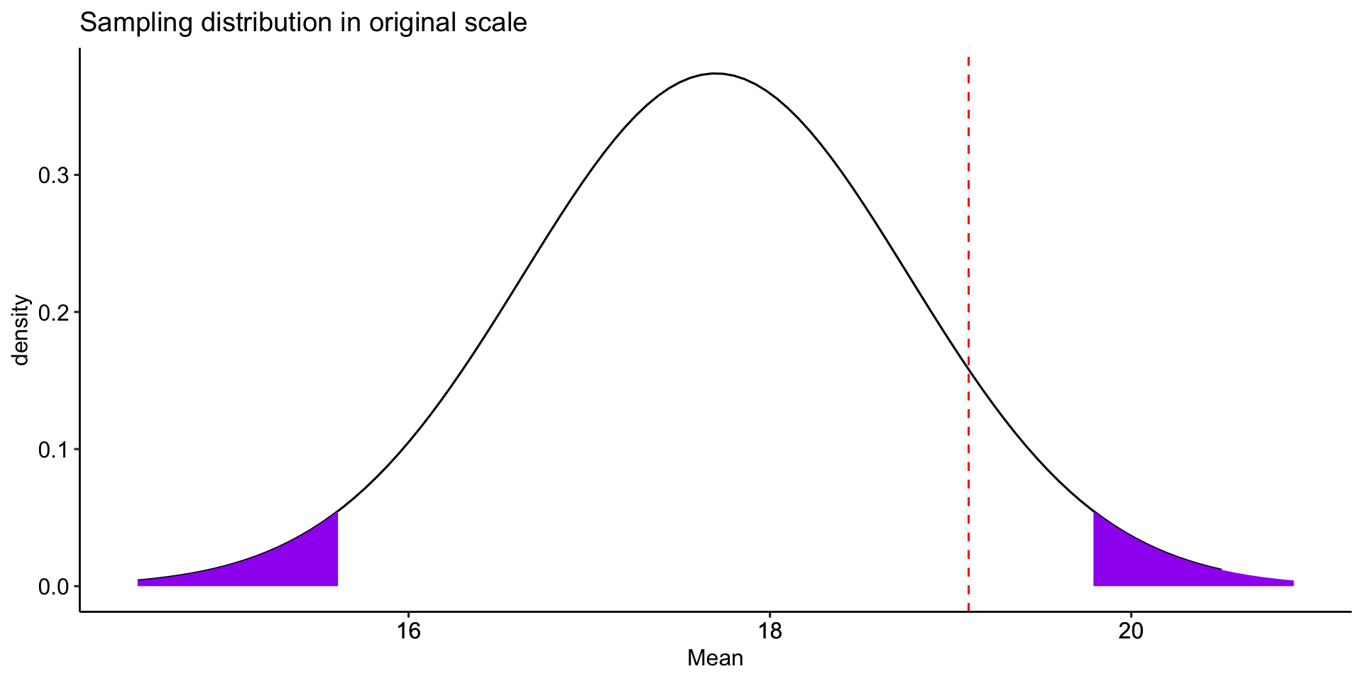 labs(x = "Mean", y = "density", title = "Sampling distribution in original scale", fill = NULL)+