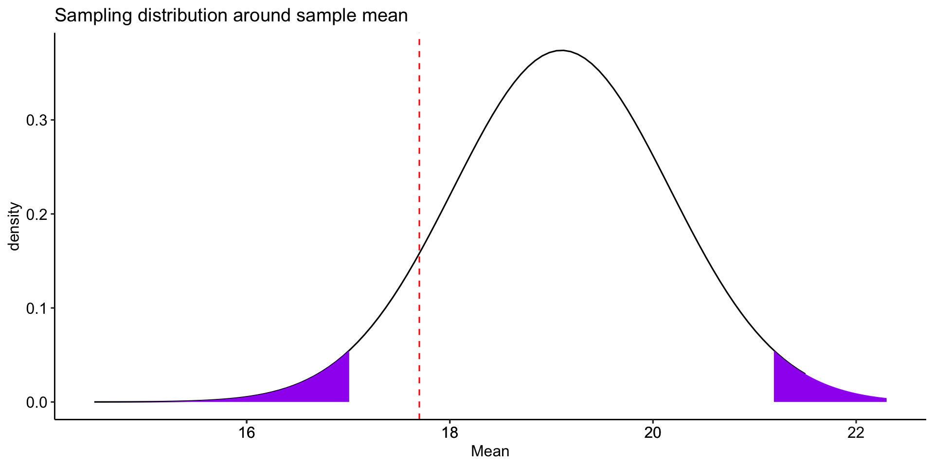 labs(x = "Mean", y = "density", title = "Sampling distribution around sample mean")+
