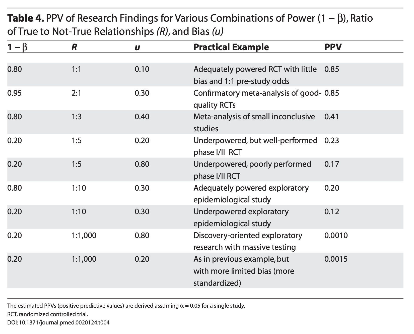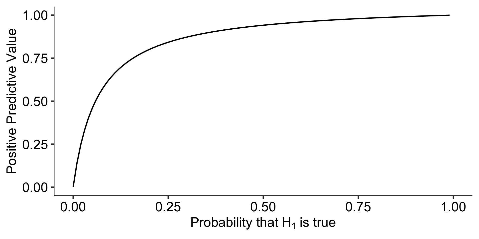 Ioannidis (2005) demonstrates that given R (the ratio of \(H_0\) false over \(H-0\) true), we can calculate the positive predictive value of a finding, which is the likelihood that \(H_1\) is true given we found a significant result: