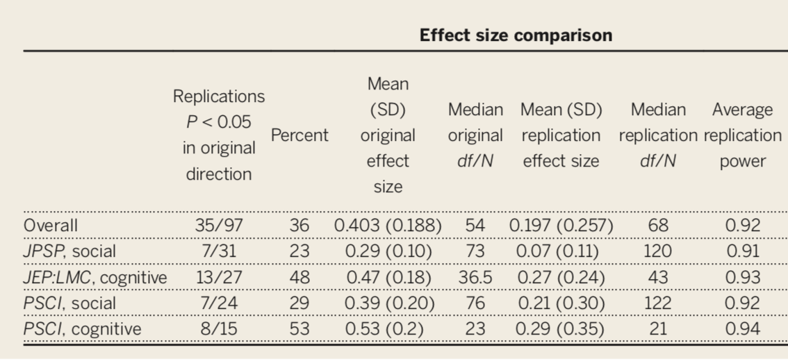 Only 36% of the studies were replicated, despite high power and claimed fidelity of the methods.