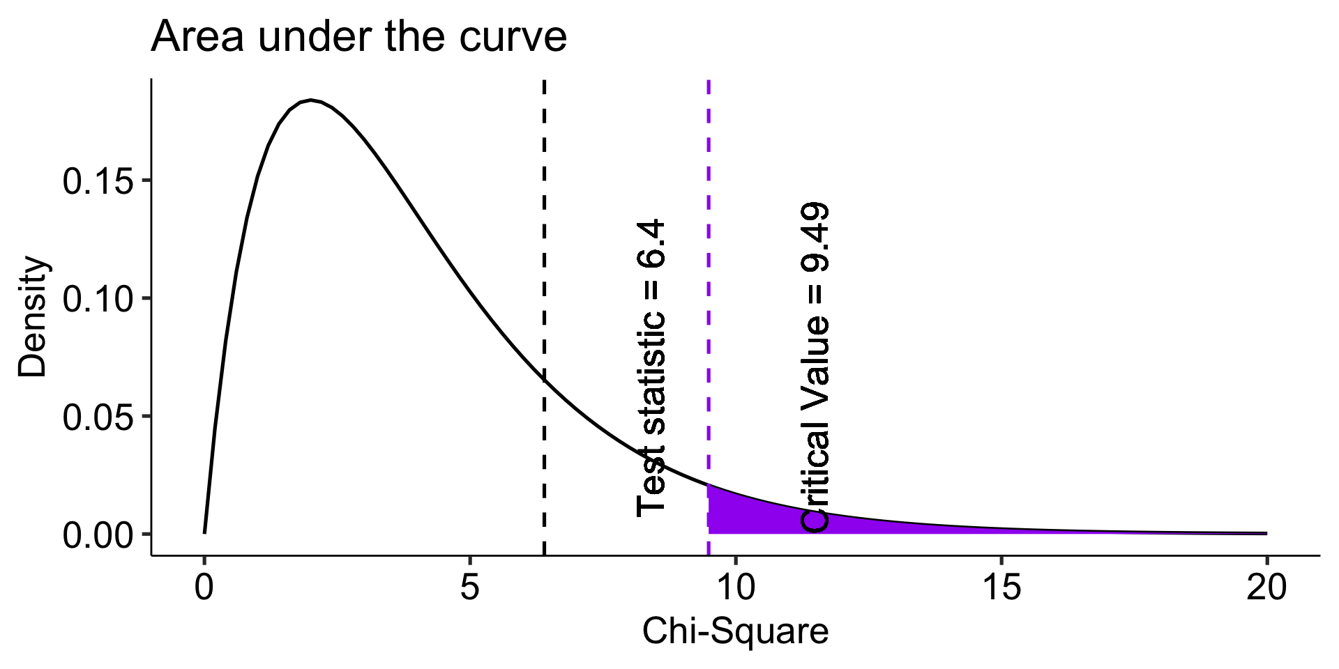 stat_function(fun = function(x) dchisq(x, df = 5-1), geom = "area", fill = "purple",