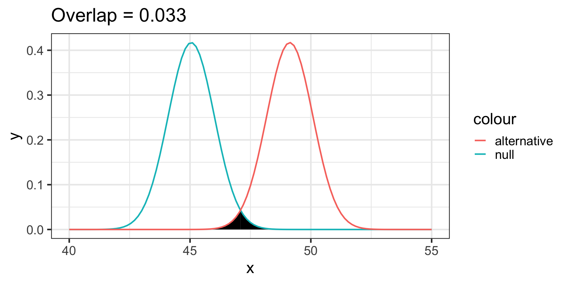 Another useful metric is the overlap between the two distributions – the smaller the overlap, the farther apart the distributions