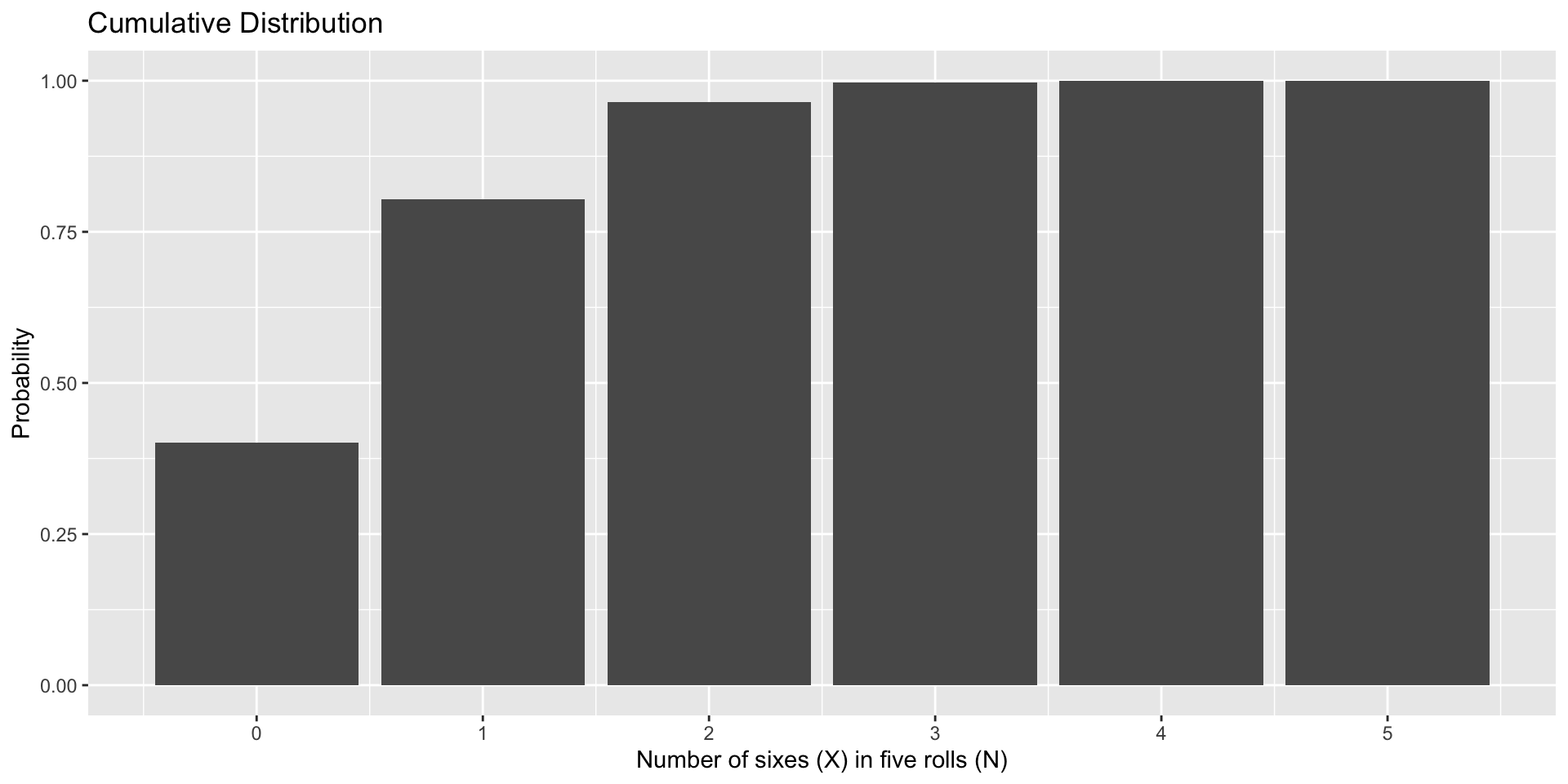 data.frame(num = 0:5, p = dbinom(x = 0:5, size = 5, prob = 1/6), three = as.factor(c(0,0,0,1,0,0))) %>% ggplot(aes(x=num, y=p, fill = three)) + geom_bar(stat="identity") + scale_x_continuous("Number of sixes (X) in five rolls (N)", breaks=c(0:5)) +scale_y_continuous("Probability")+ guides(fill = "none") + ggtitle("Binomial Probability Distribution")