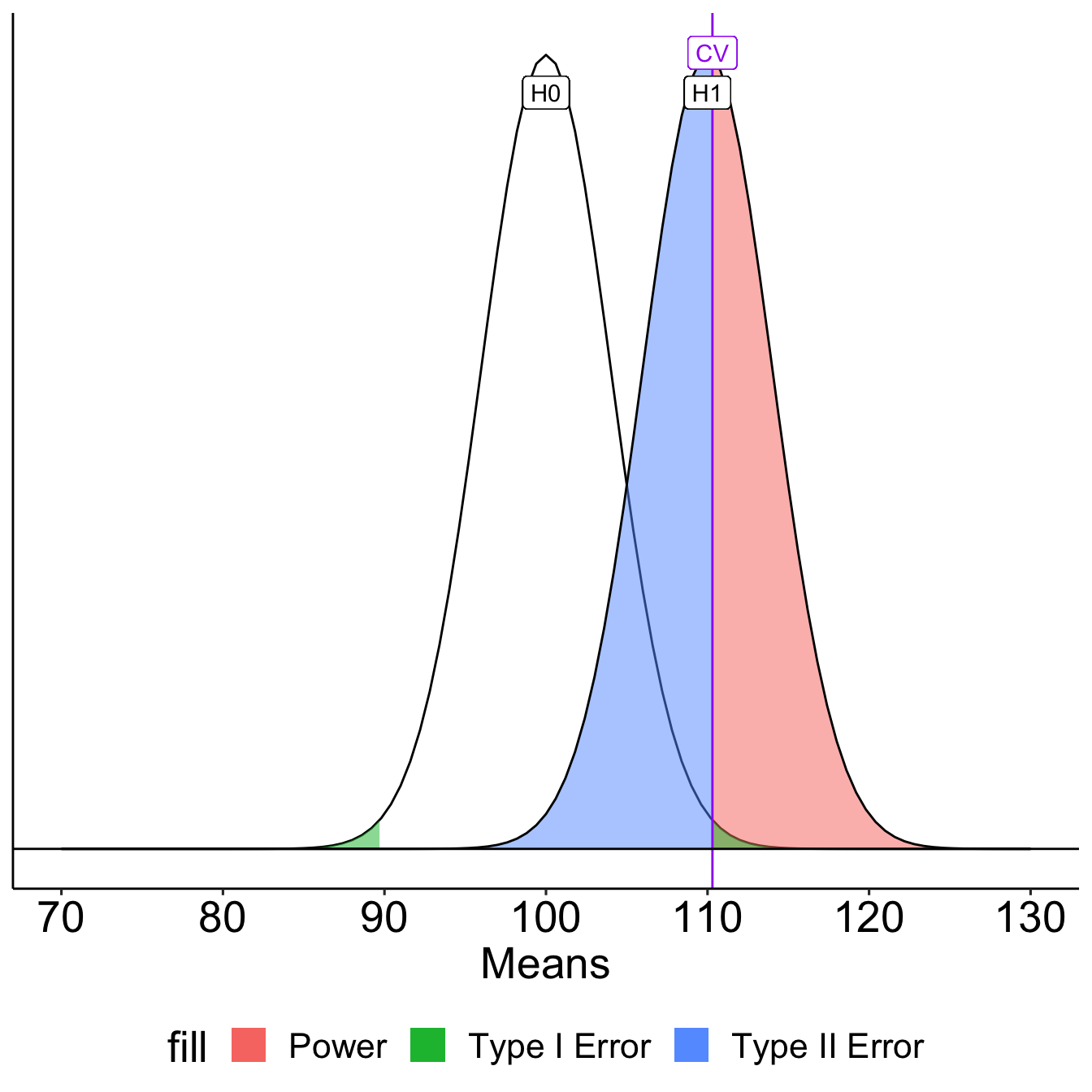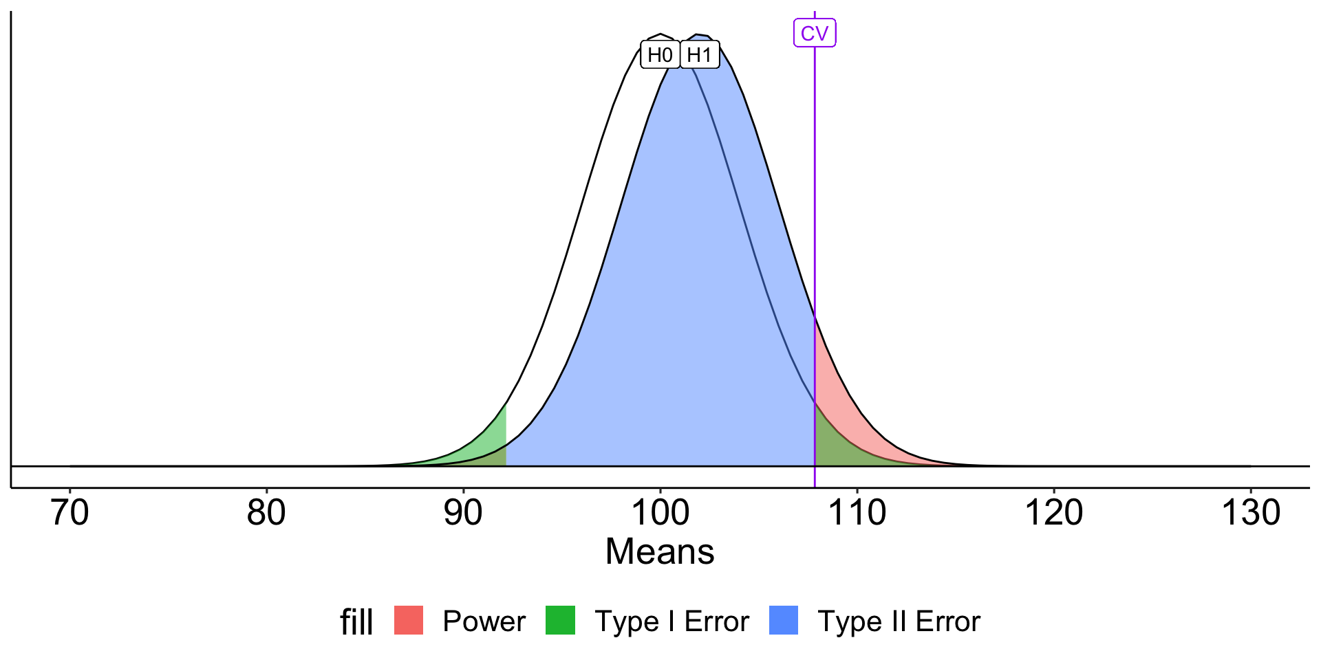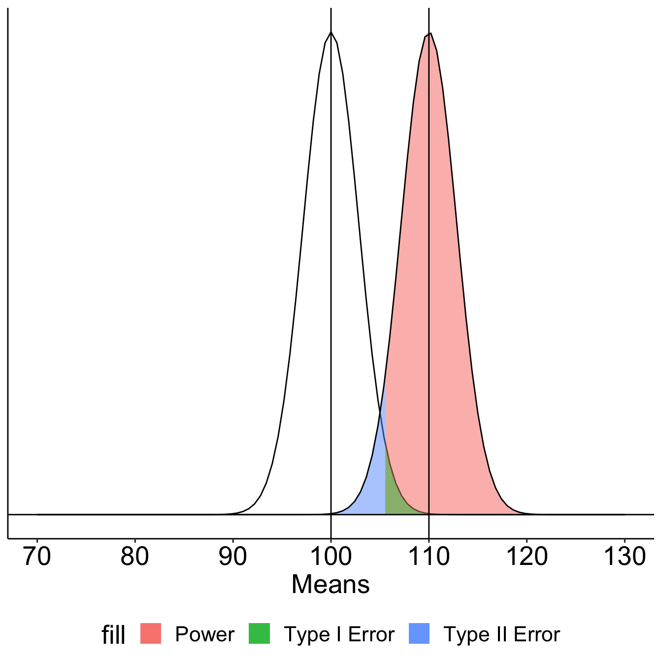 stat_function(aes(fill = "Type II error"), fun = function(x) dnorm(x, mean = xbar, sd = sem),