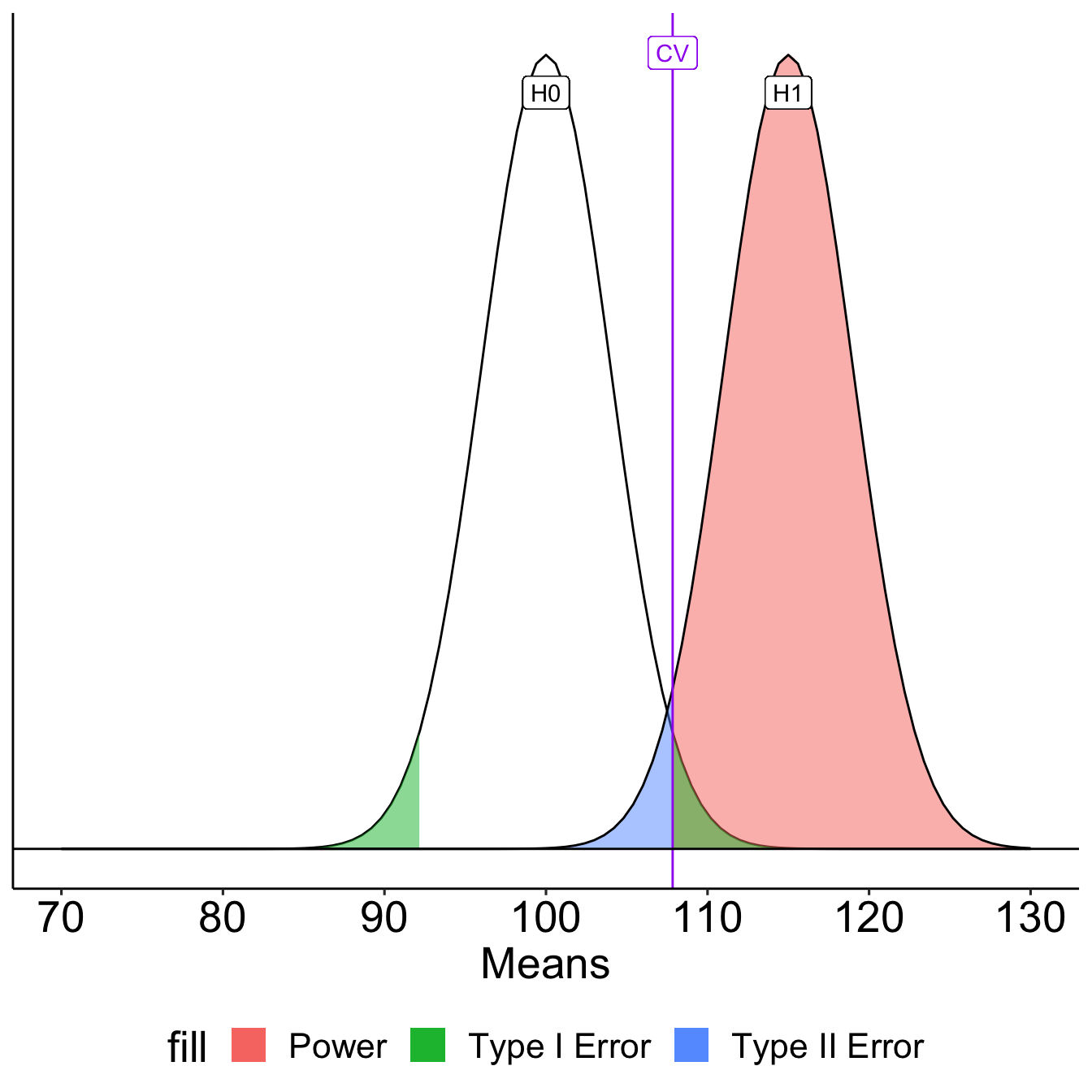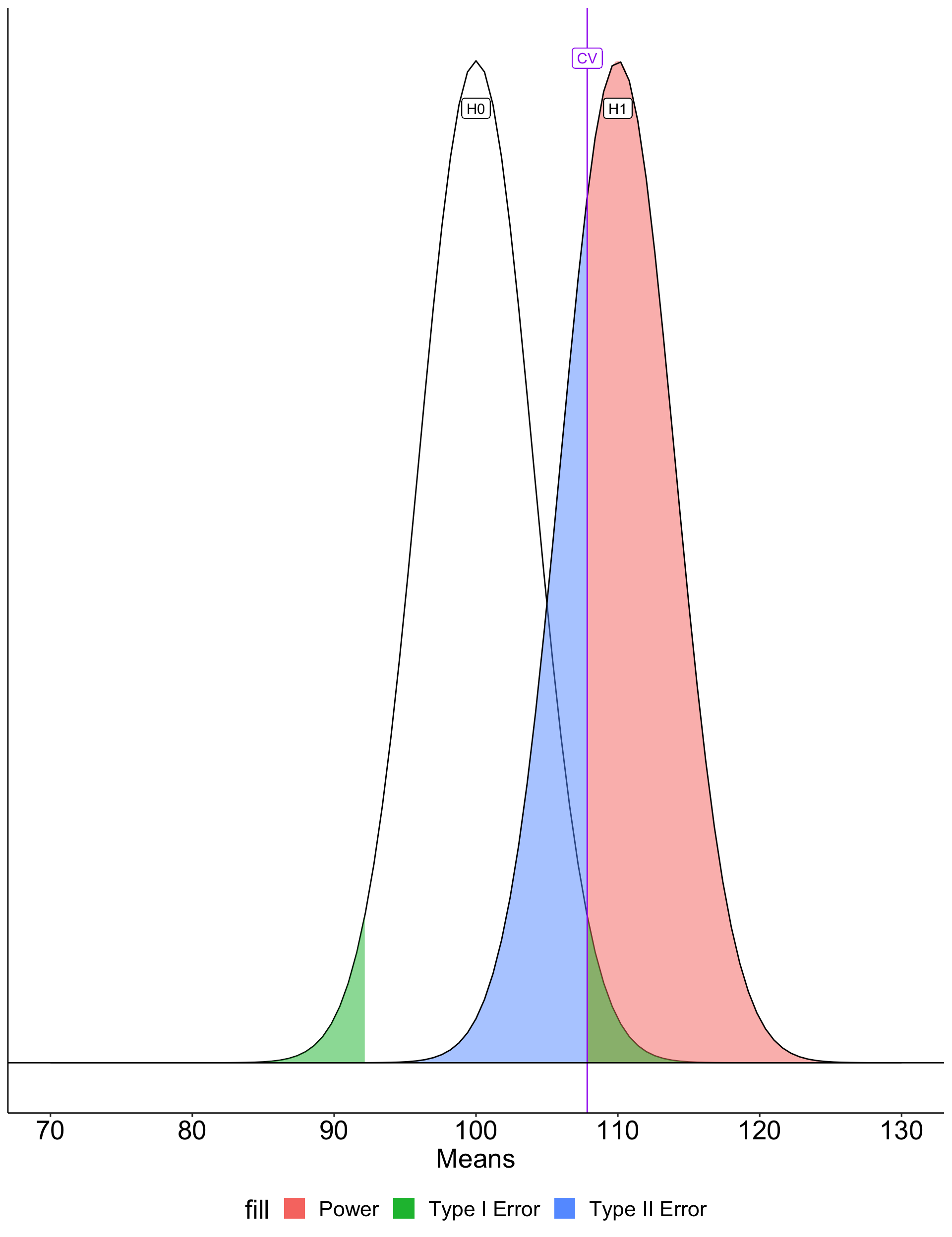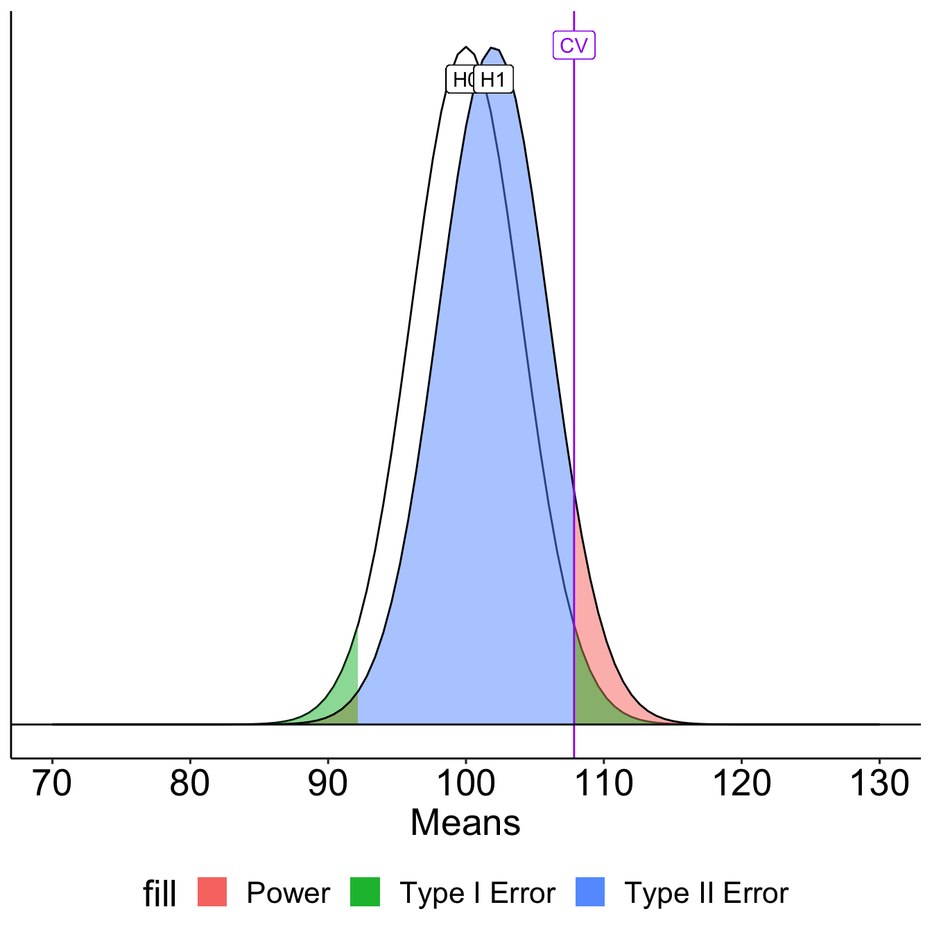 stat_function(aes(fill = "Type II error"), fun = function(x) dnorm(x, mean = xbar, sd = sem),