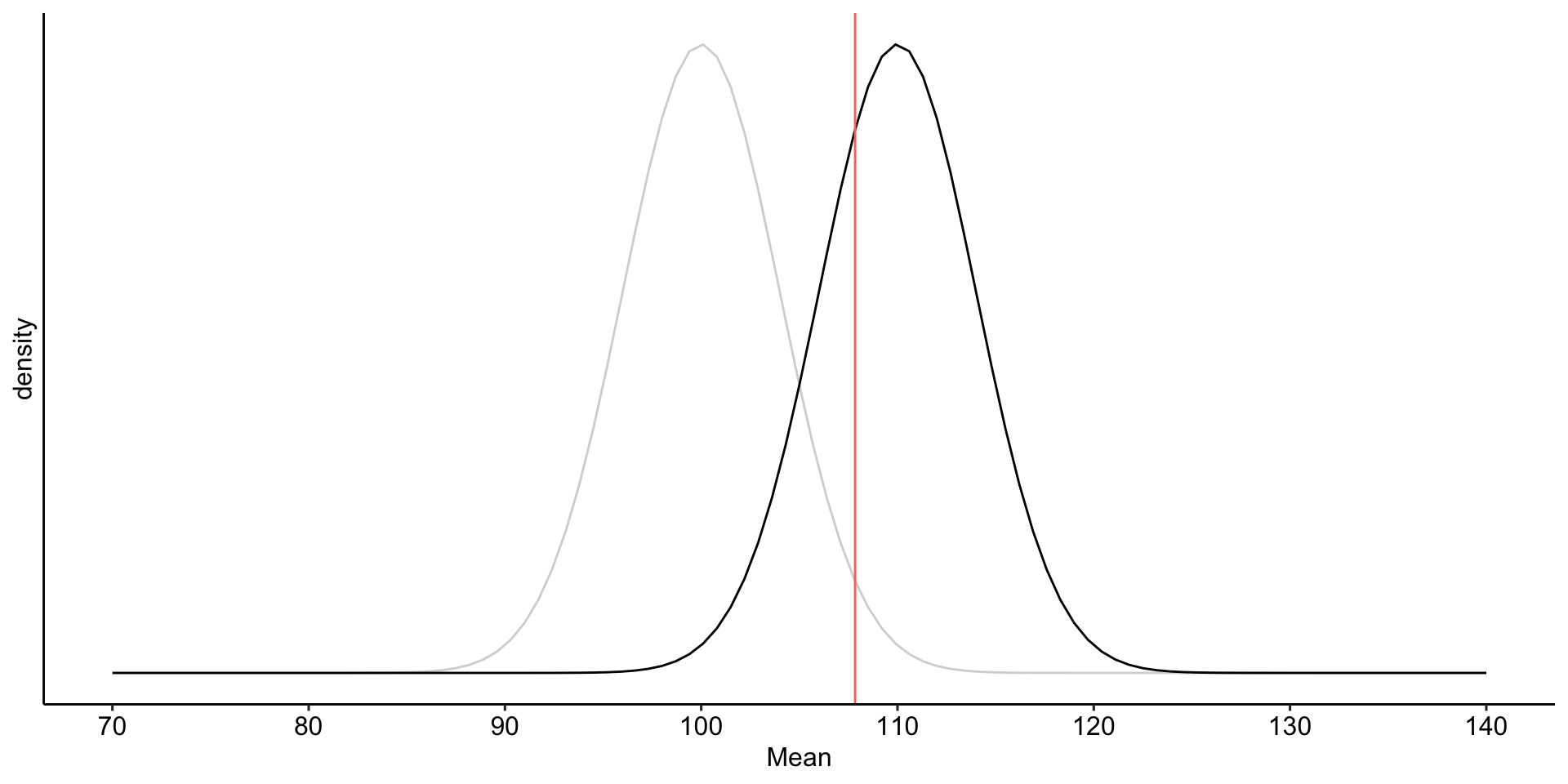 The choice of 110 as the mean of \(H_1\) is completely arbitrary. What if we believe that the alternative mean is 115? This larger signal should be easier to detect.