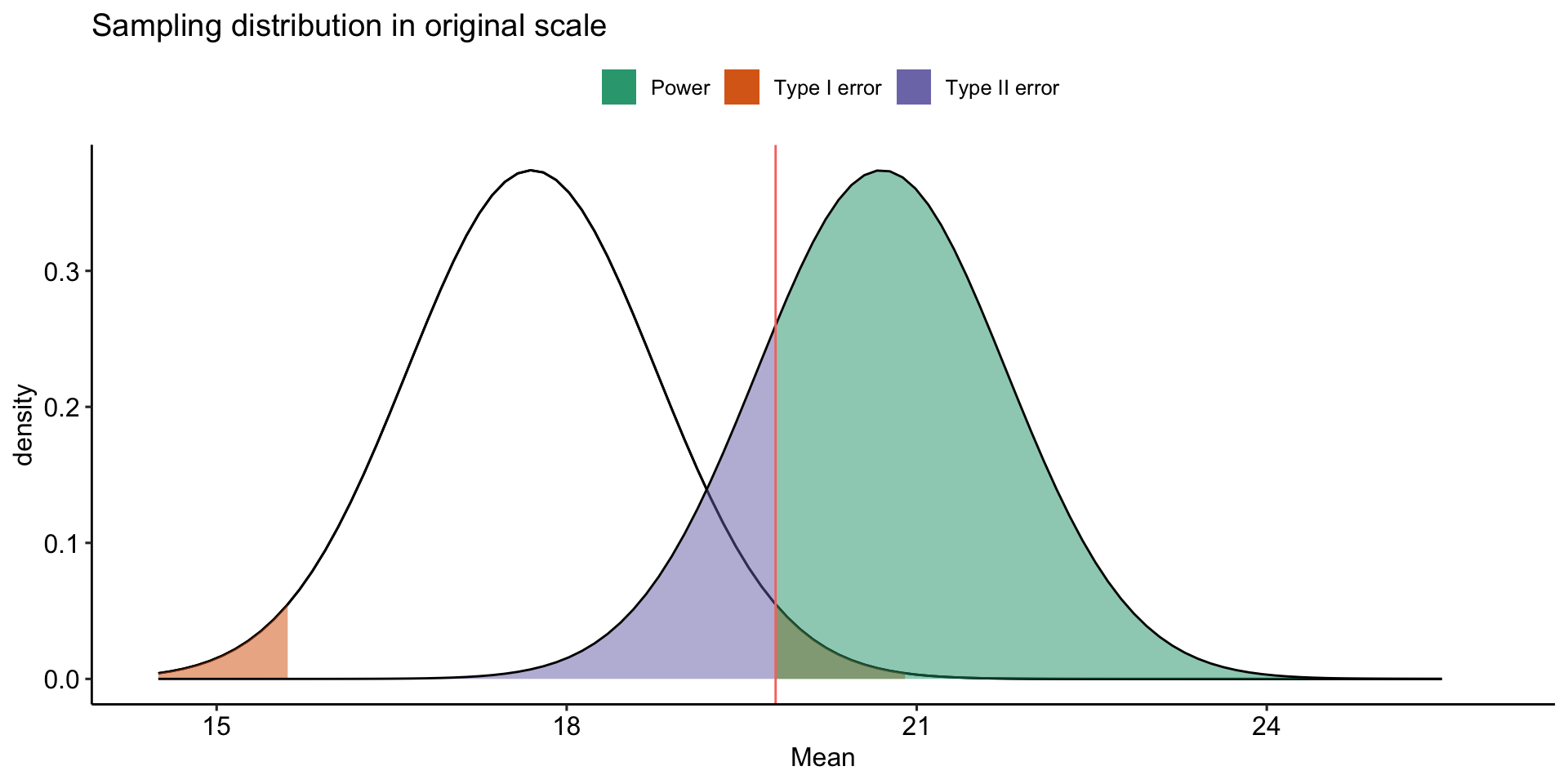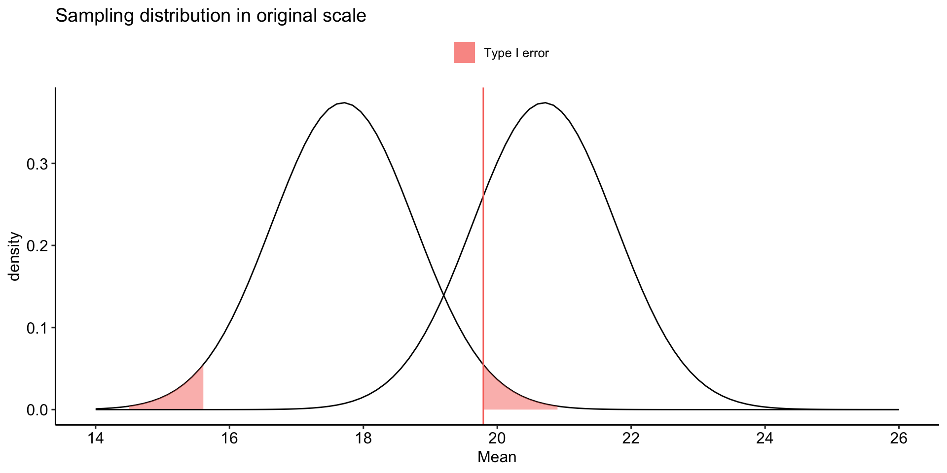 stat_function(aes(fill = "Type I error"), fun = function(x) dnorm(x, mean = mu, sd = sem),