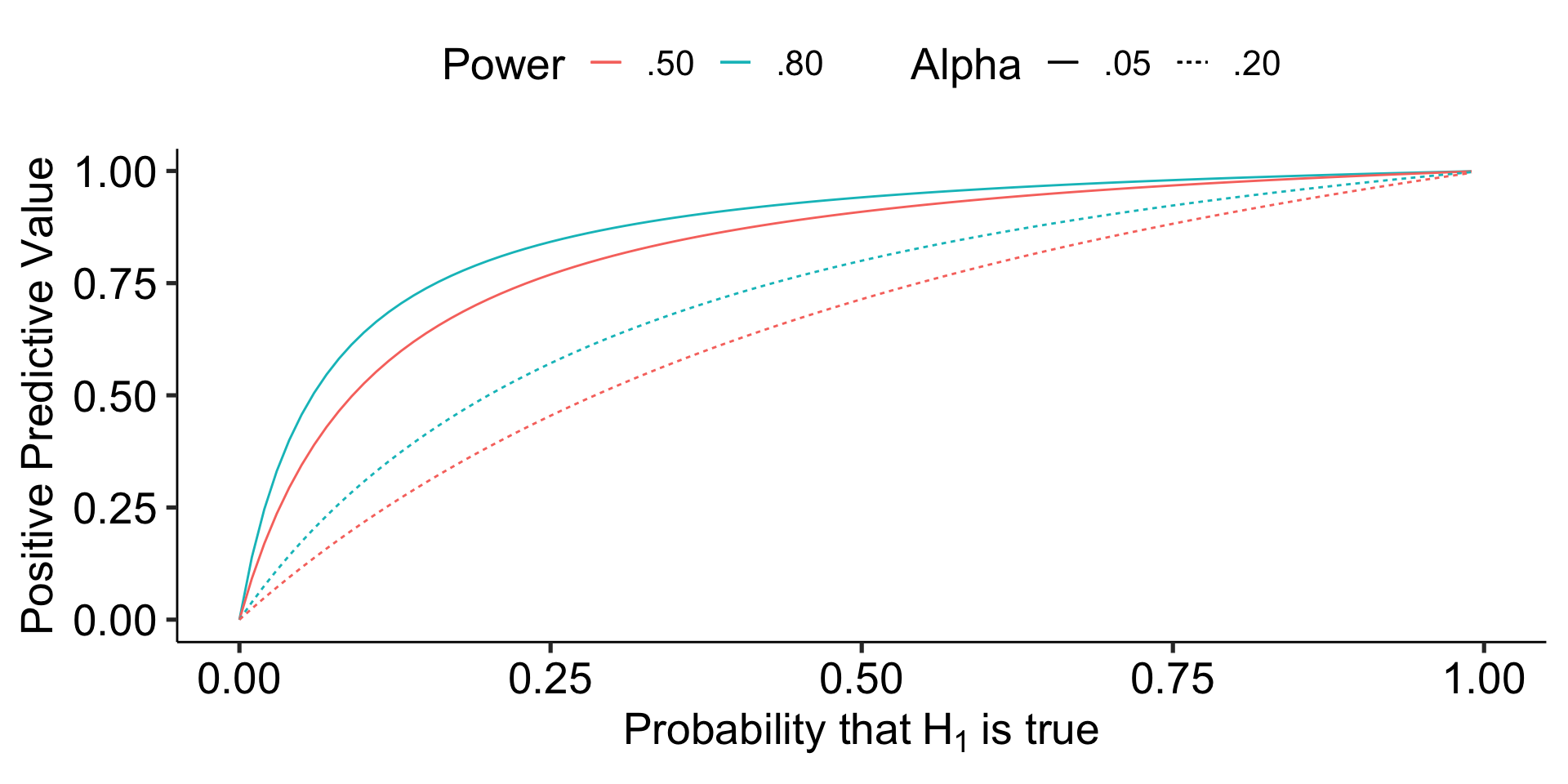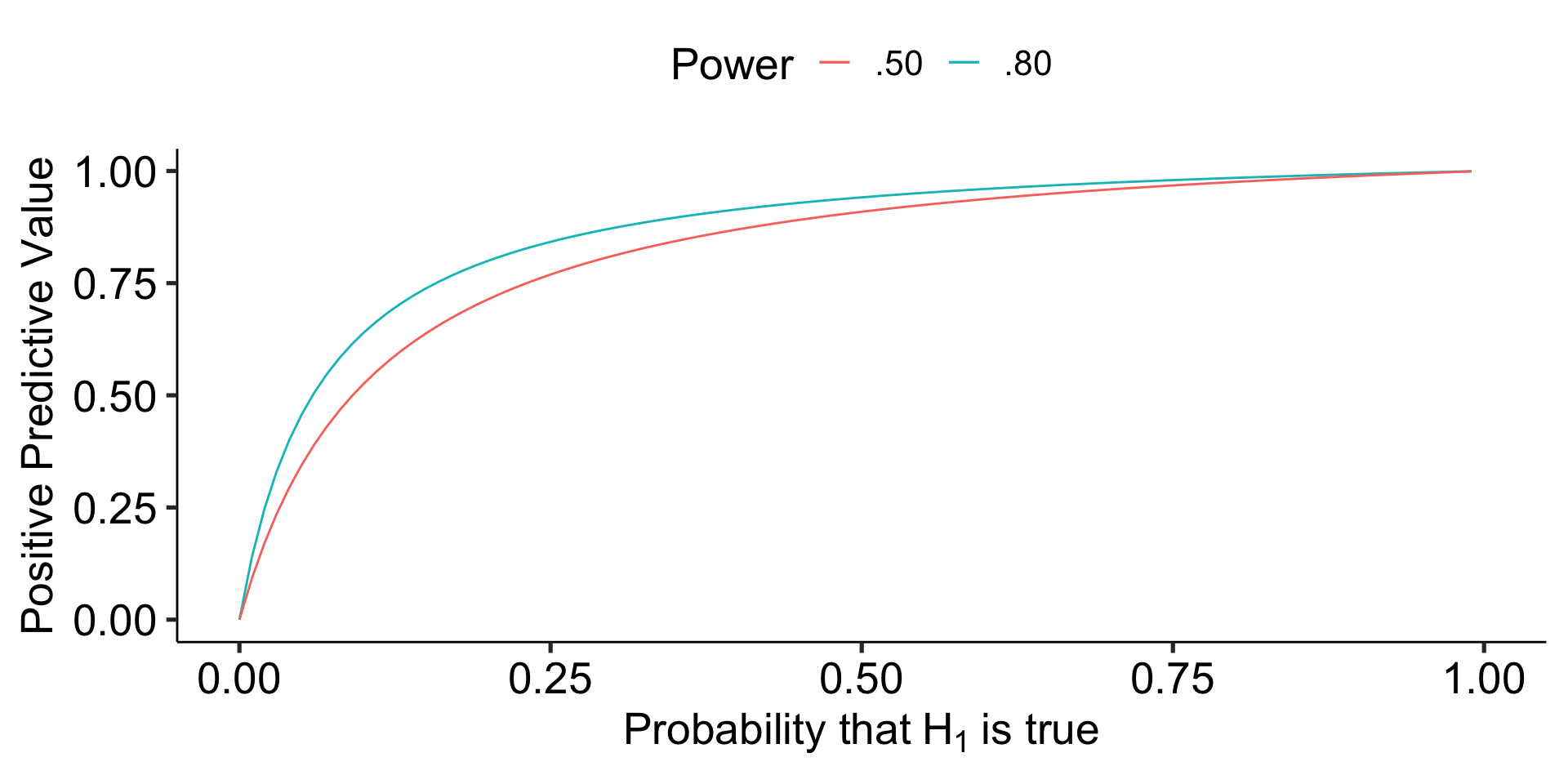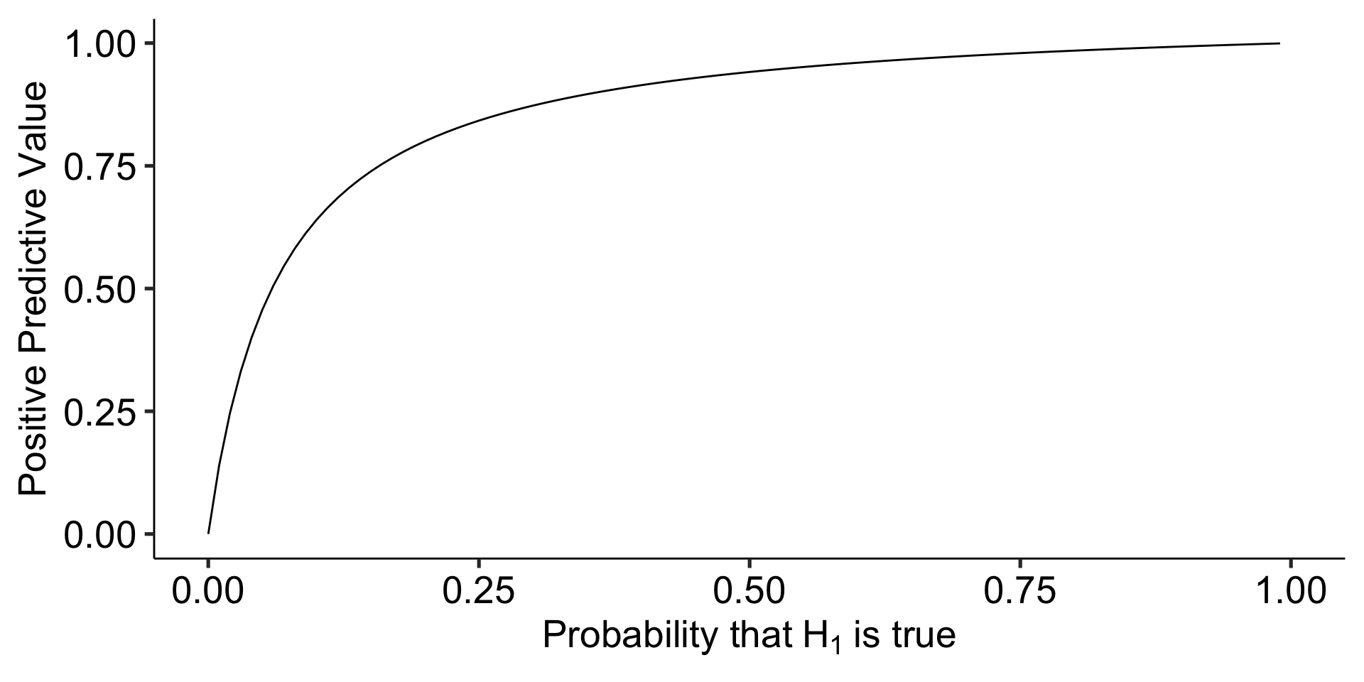 Ioannidis (2005) demonstrates that given R (the ratio of \(H_0\) false over \(H-0\) true), we can calculate the positive predictive value of a finding, which is the likelihood that \(H_1\) is true given we found a significant result: