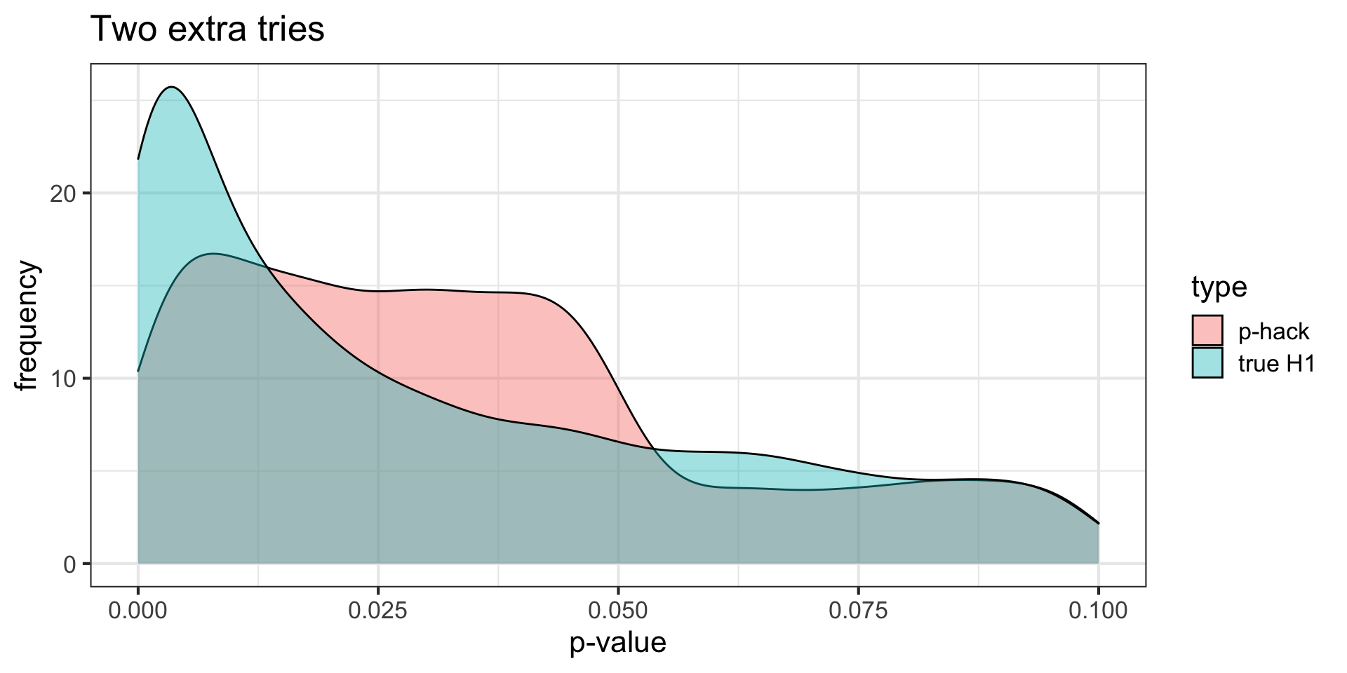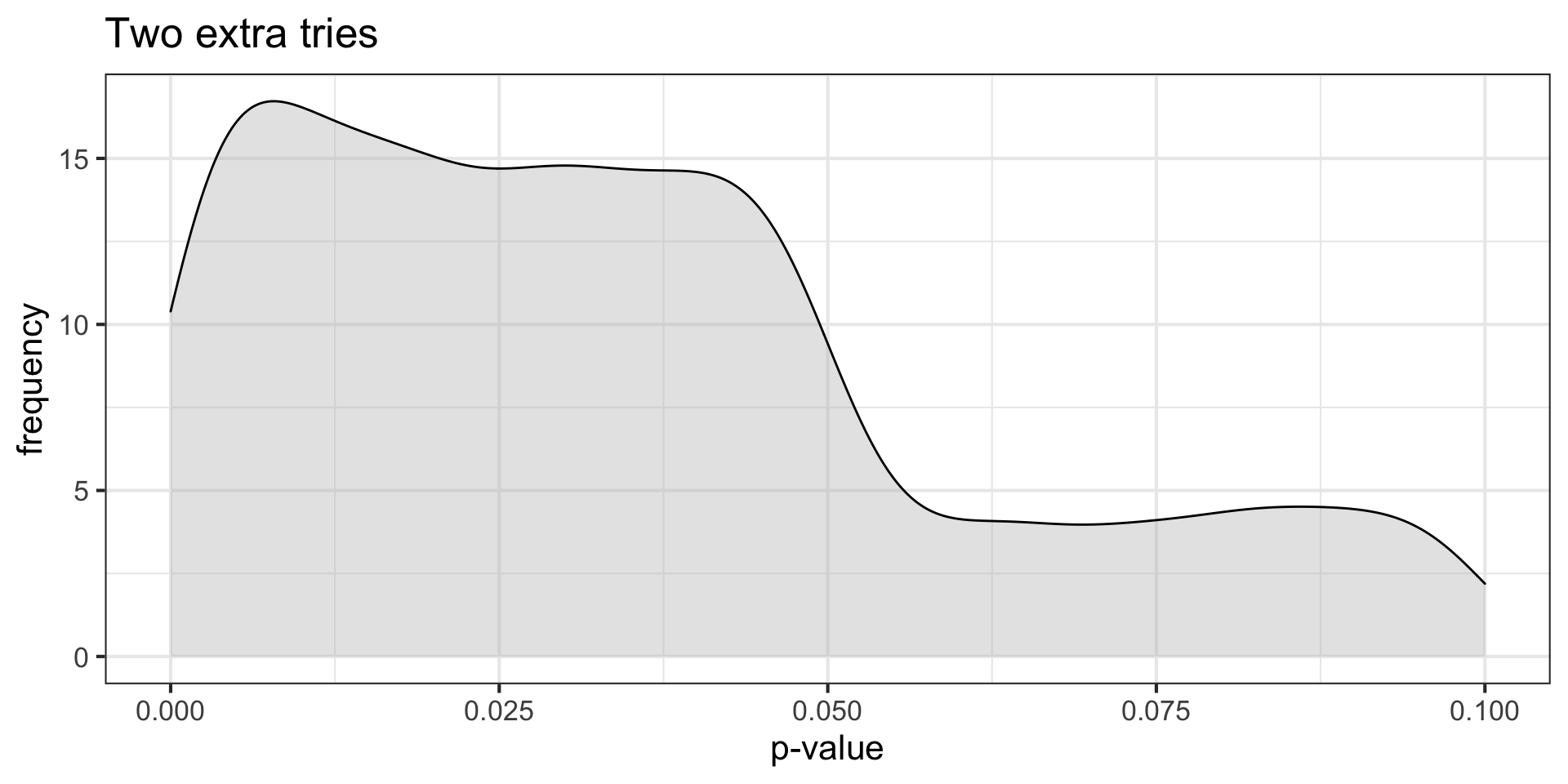 title = "Two extra tries")p-curve made it clear that if our null hypotheses were indeed false, we would most often see very small p-values.