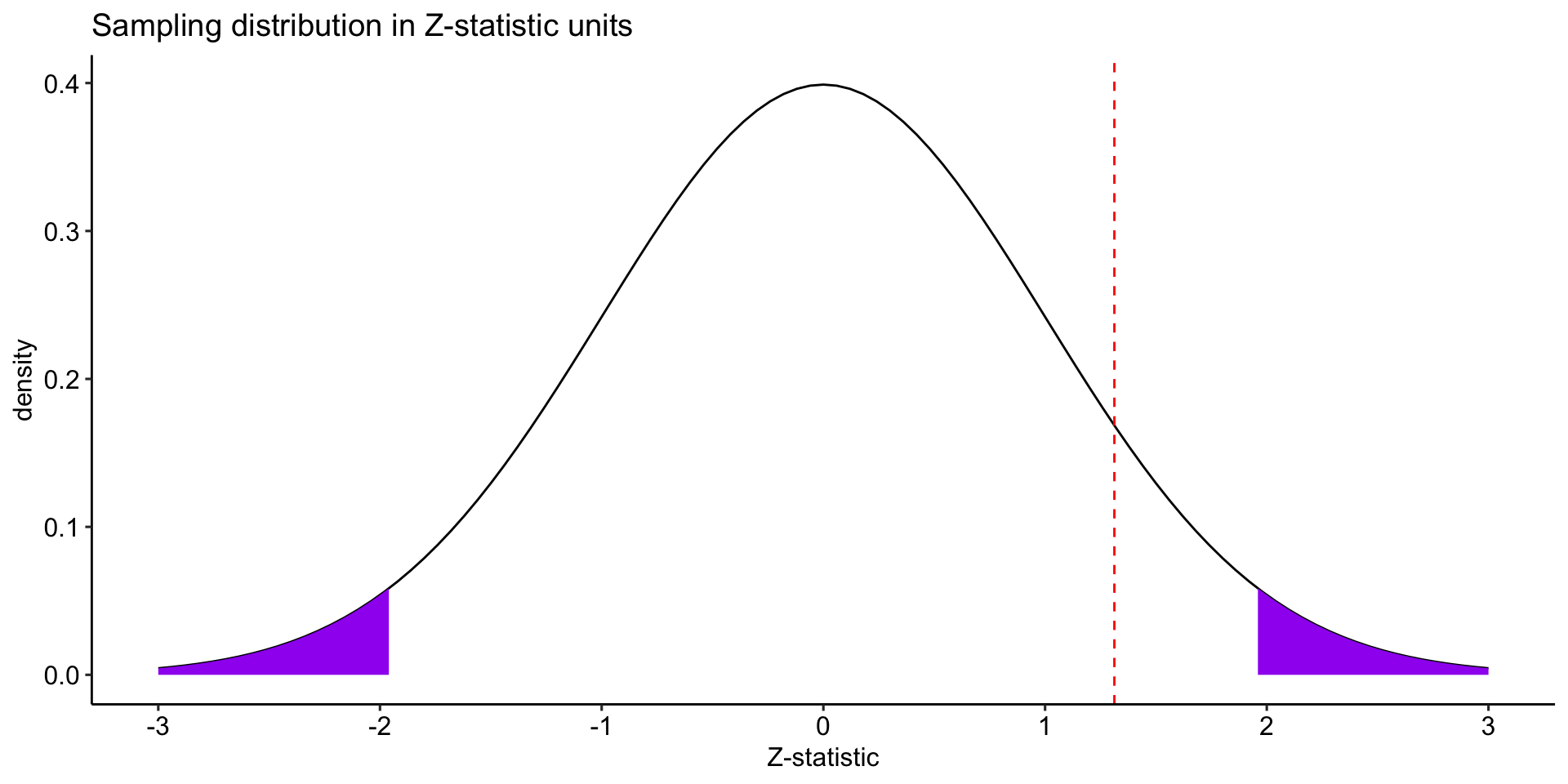 labs(x = "Z-statistic", y = "density", title = "Sampling distribution in Z-statistic units")+