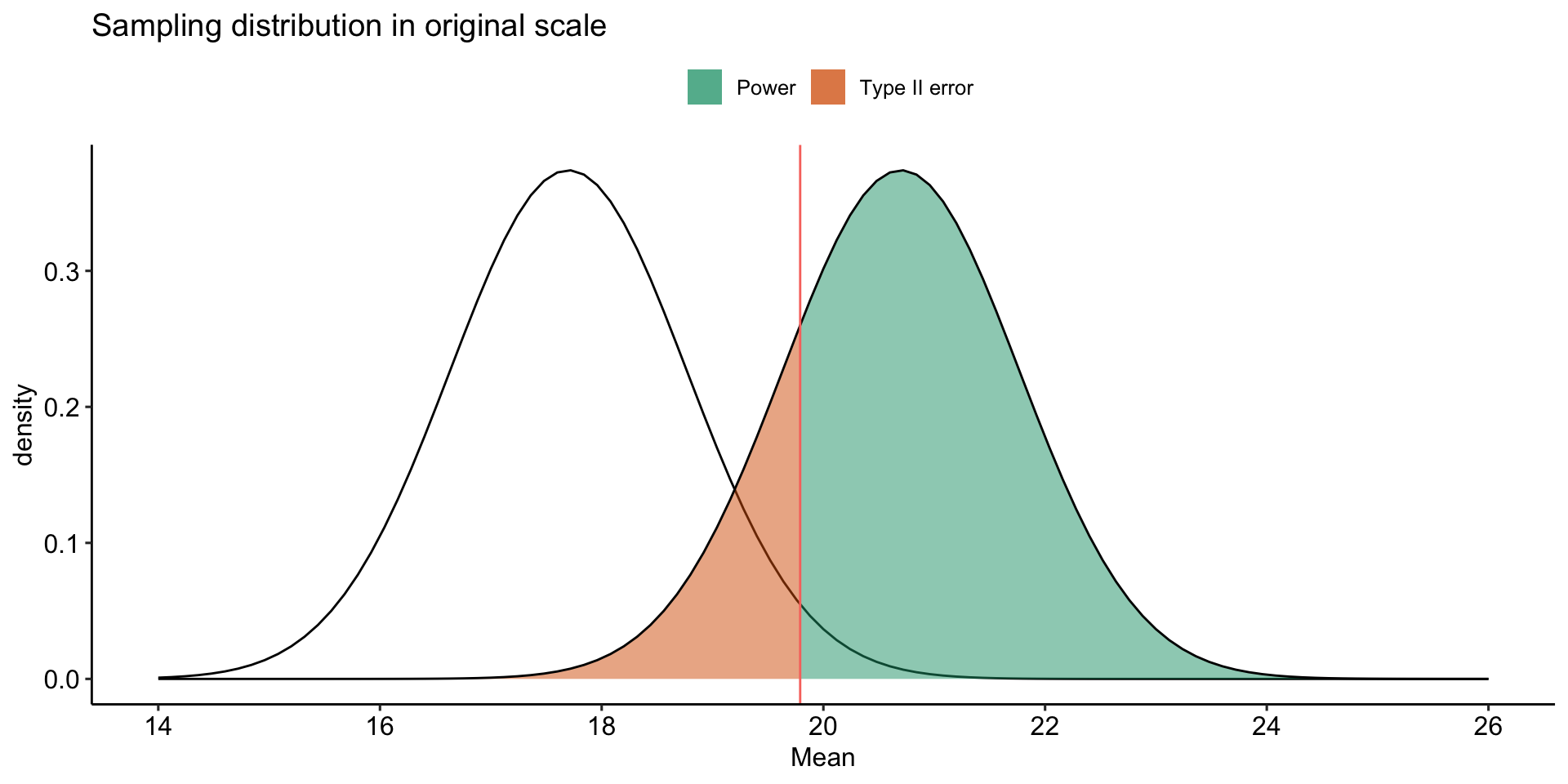 labs(x = "Mean", y = "density", title = "Sampling distribution in original scale", fill = NULL)+