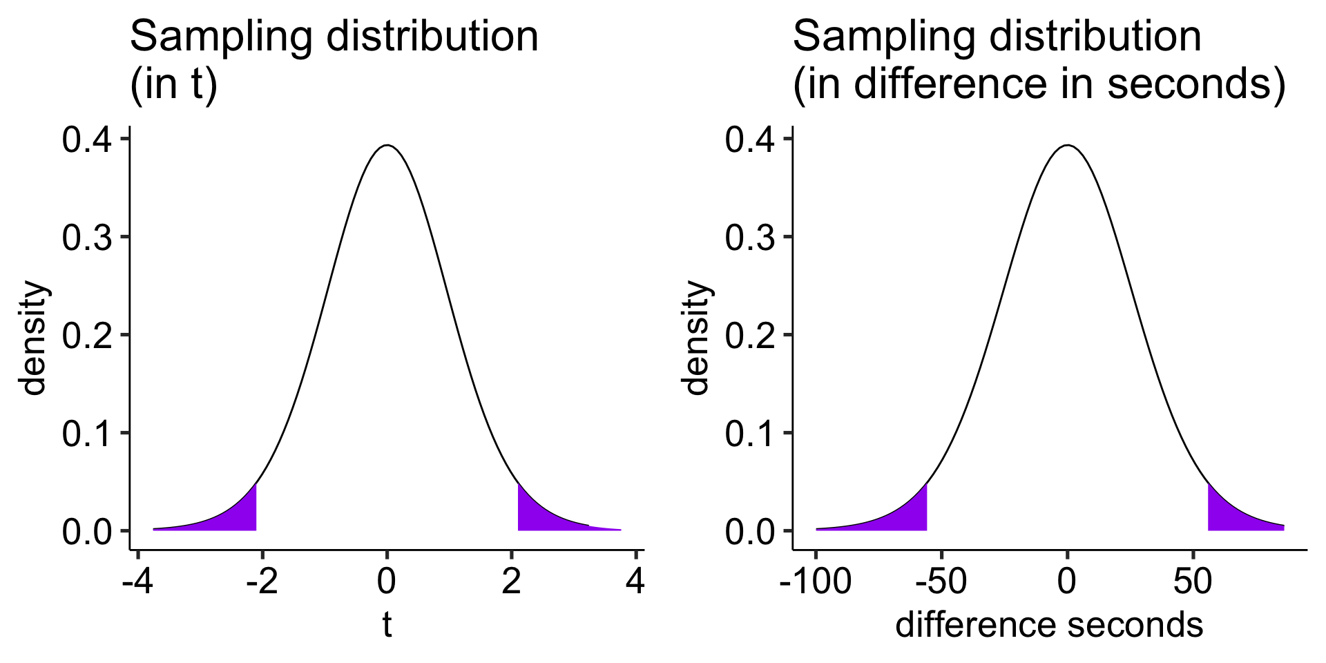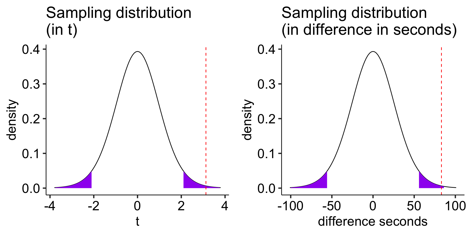 ggarrange(plot_t, plot_x, ncol = 2)Another option is to calculate the area above the absolute value of the test statistic and multiply that by two – this estimates the probability of finding this test statistic or more extreme.