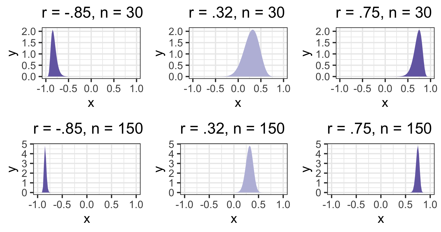 If we want to make calculations around correlation values that are not equal to 0, then we will run into a skewed sampling distribution. This applies to both calculating confidence intervals around estimates of correlations and null hypotheses in which \(\rho \neq 0\).