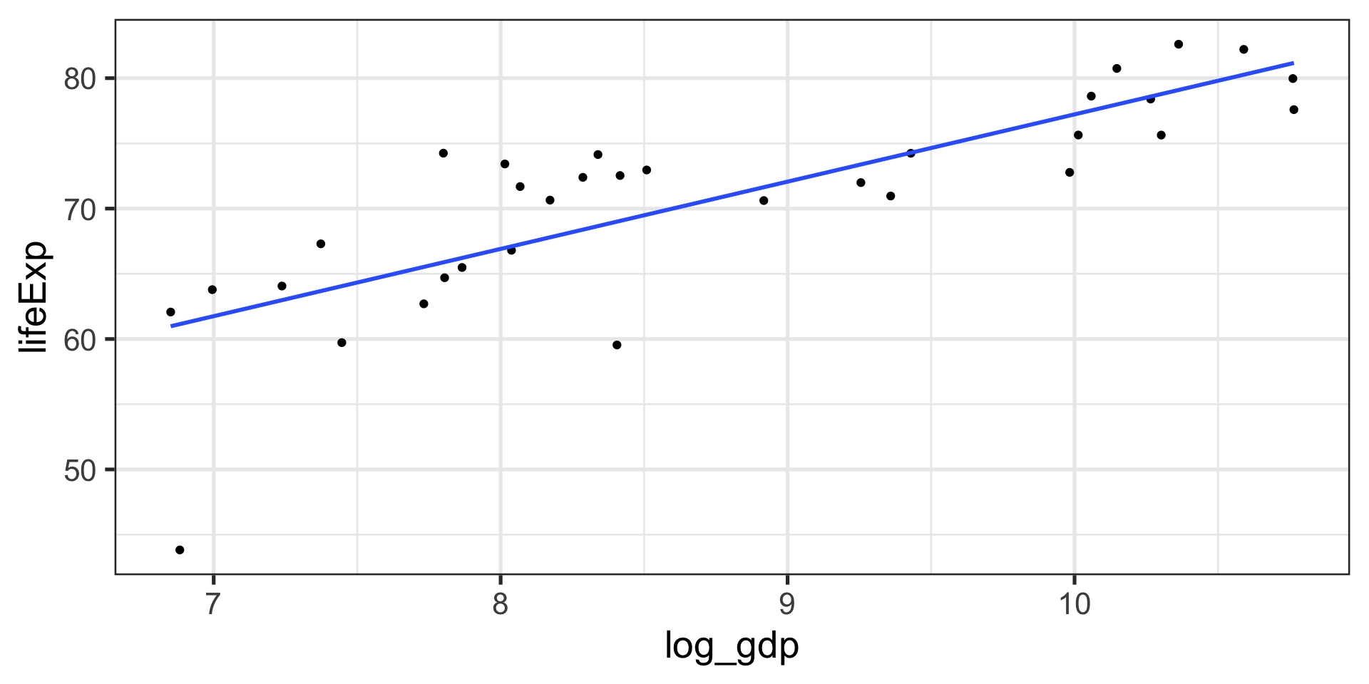 lm(formula = lifeExp ~ log_gdp, data = gapminder)