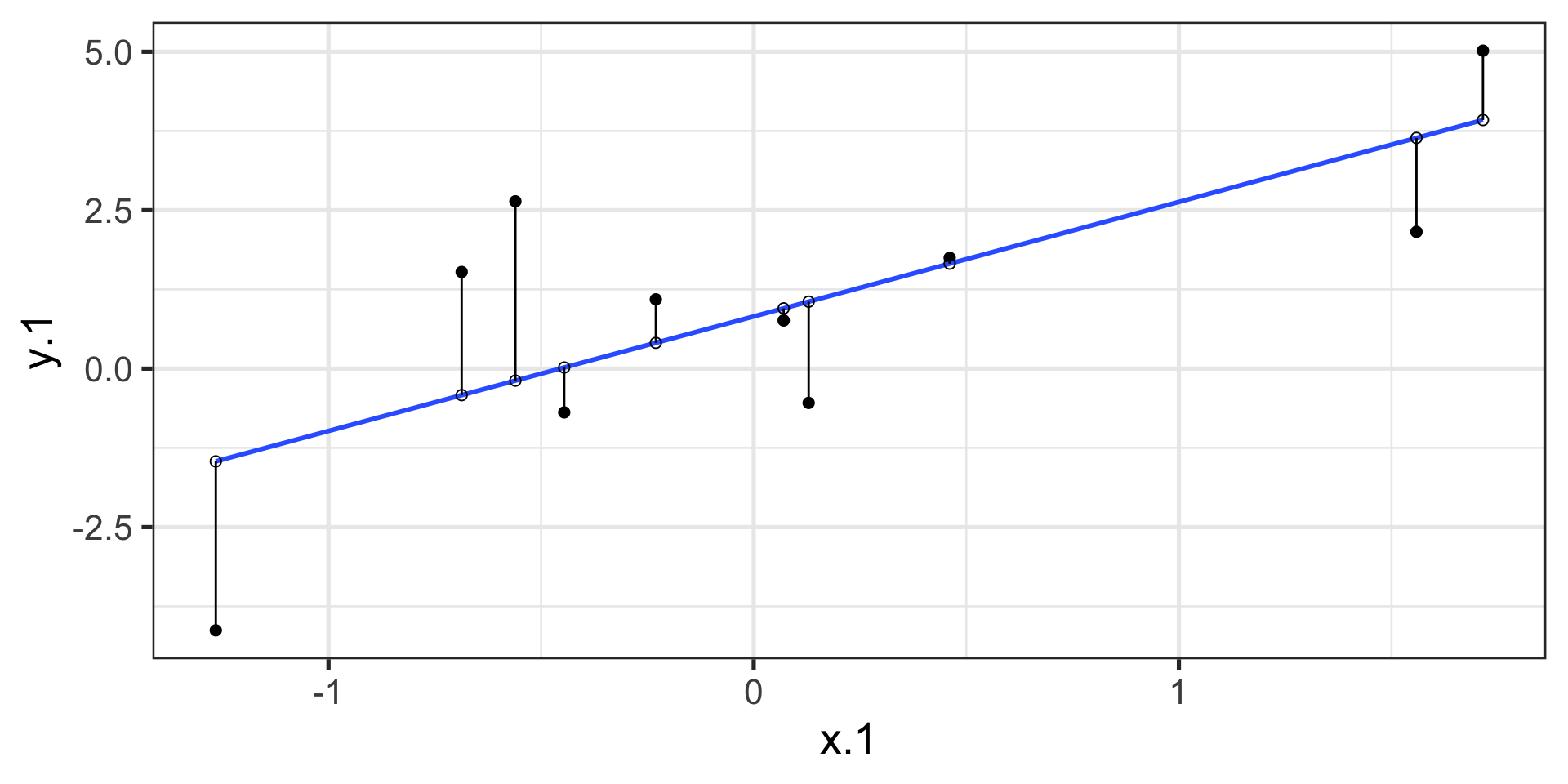 The second is the equation that represents our expected or fitted value of the outcome \((\hat{Y_i})\), sometimes referred to as the “predicted value.” This expected value is the sum of some constant \((b_0)\), the weighted \((b_1)\) observed values of the predictors \((X_i)\).