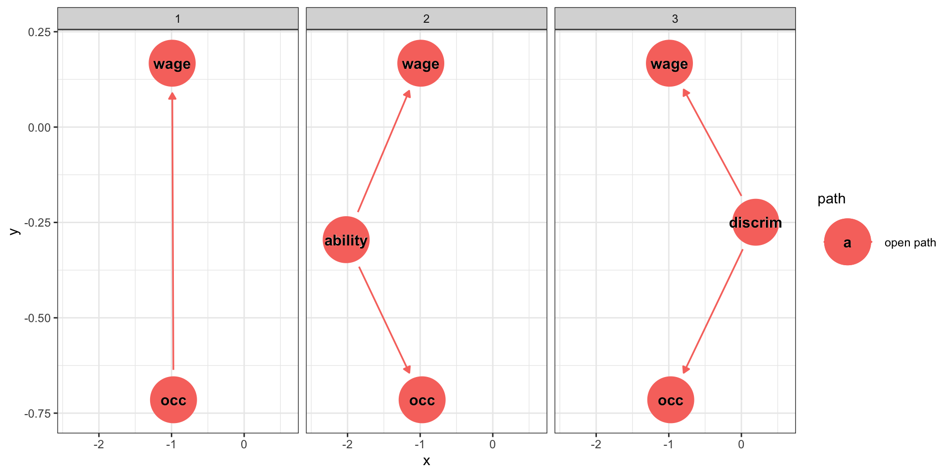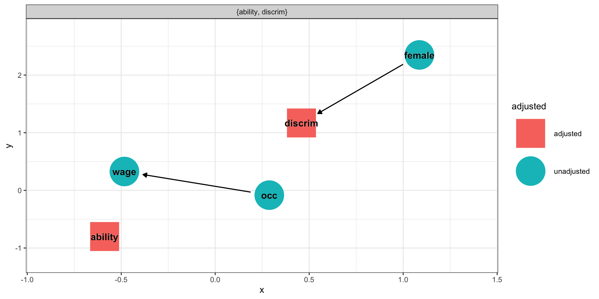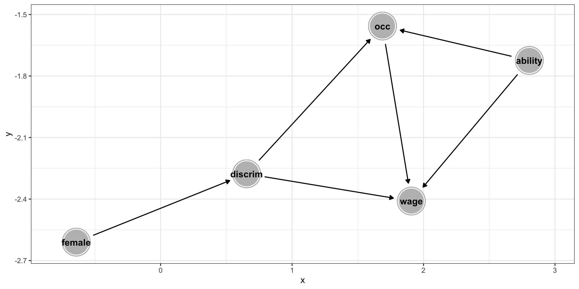 Based on the causal structure I hypothesized last slide, if I want to estimate how much occupation causes income, I should control for discrimination and ability, but I don’t need to control for gender.