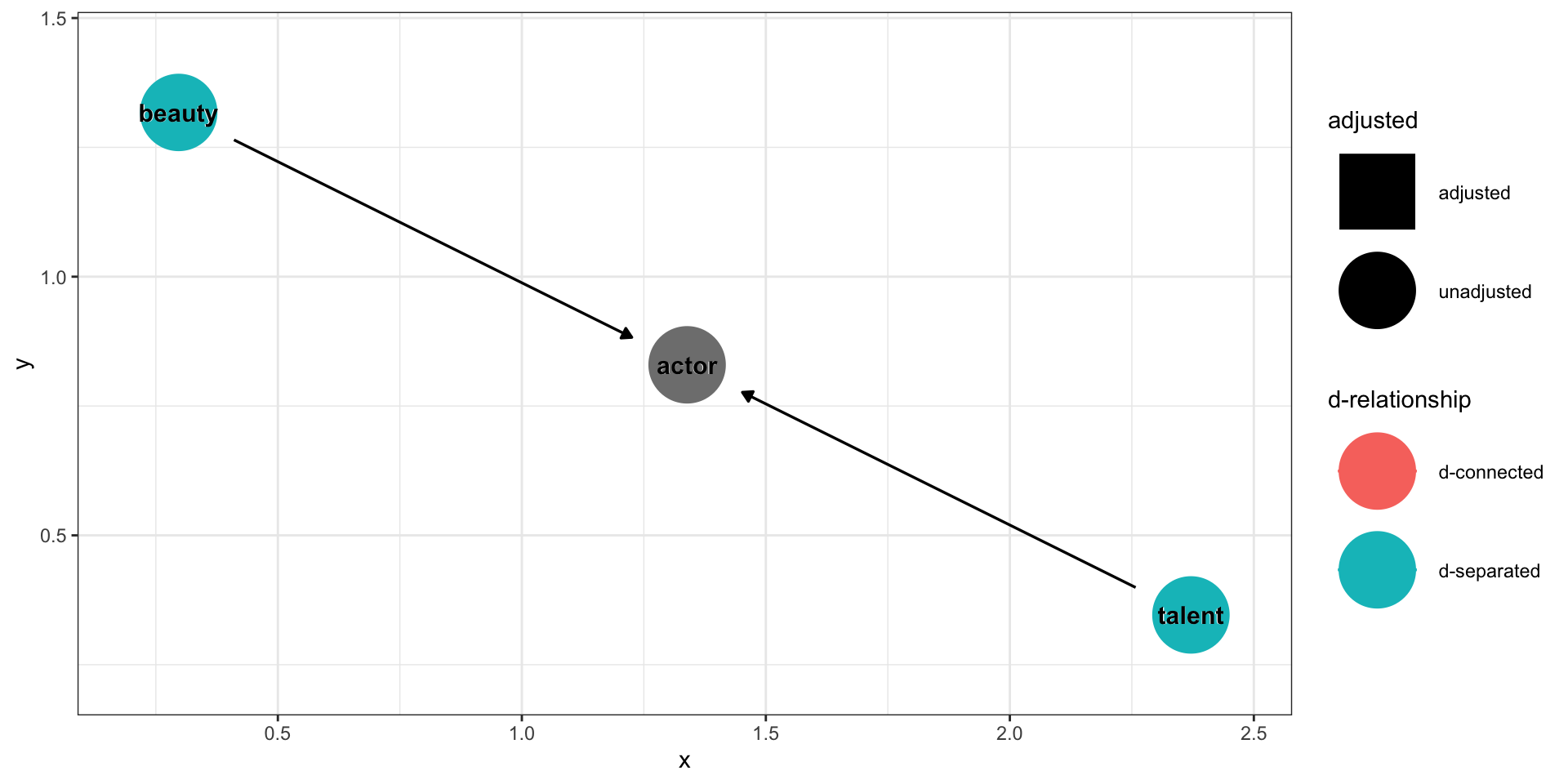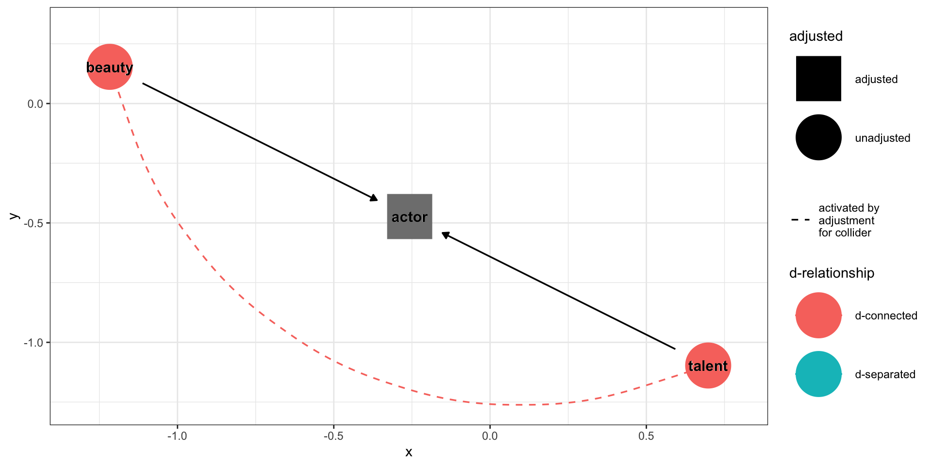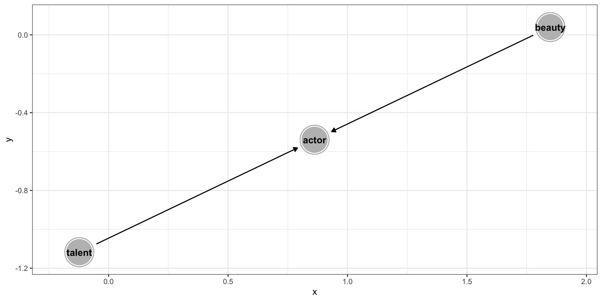 Inverted forks also teach us what not to control for: colliders. A collider for a pair of constructs is any third construct that is caused by both constructs in the pair. Controlling for (or conditioning on) these variables introduces bias into your estimates.