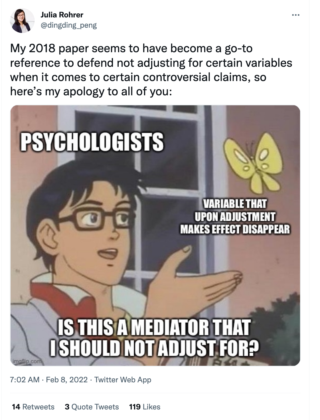 It’s true that presence of a correlation is not sufficient to demonstrate causality. However, this axiom has been overgeneralized to the point where psychologists refuse to acknowledge any observational work as indicative of causal models. This ignores a rich history of modeling work that demonstrated that – under certain assumptions – correlational work can uncover the real causal mechanisms.