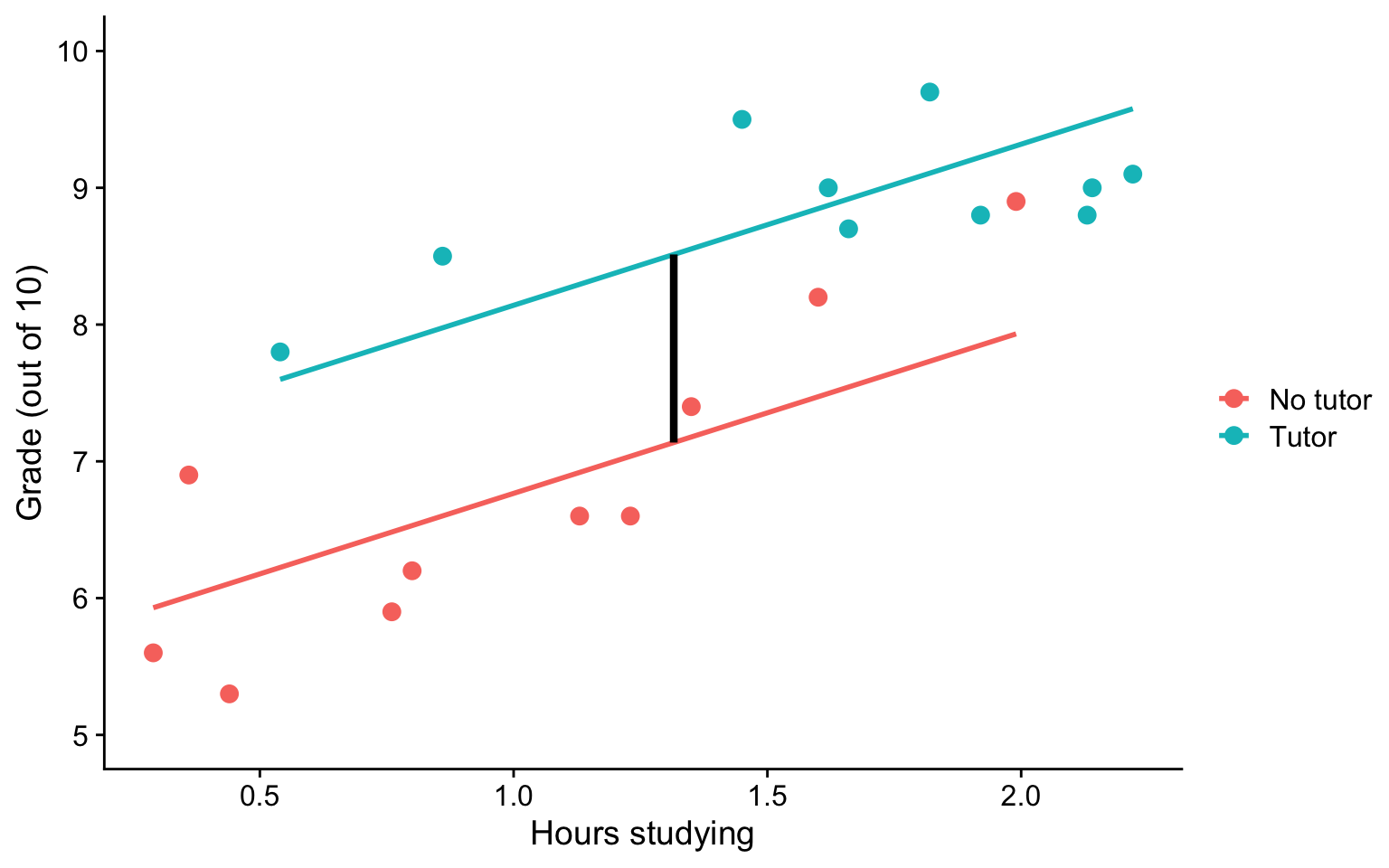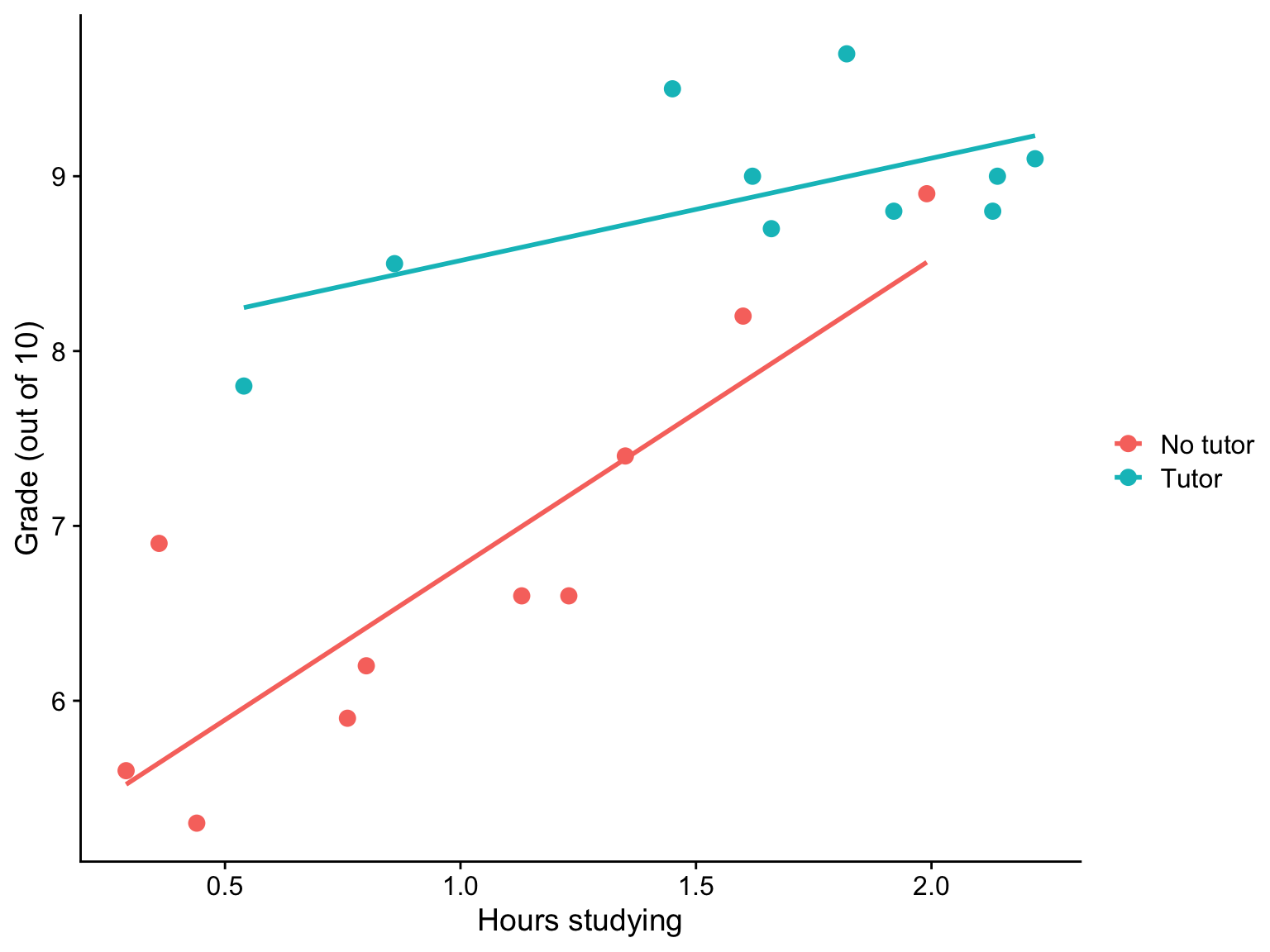 labs(x = "Hours studying", y = "Grade (out of 10)", color = "") +