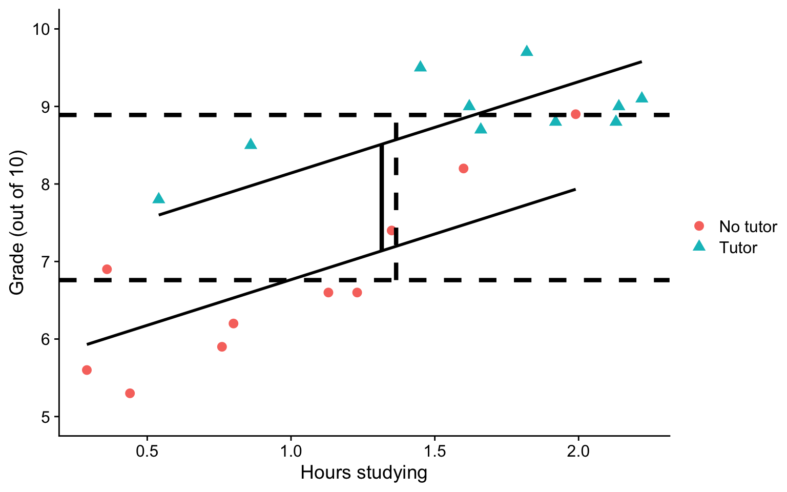 labs(x = "Hours studying", y = "Grade (out of 10)", color = "", shape = "") +