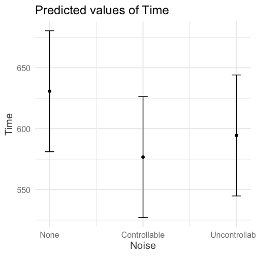 class: center, middle, inverse, title-slide # Interactions (V) --- ## Reminder Go to lab on Friday!!! * Download LaTex before lab starts. Homework 2 due on Monday (9 am) --- ## Last time... Factorial ANOVA * Estimated marginal means * Estimated cell means * Sums of squares --- ## ANOVA vs Regression .pull-left[ ### Factorial ANOVA Interaction tests whether there are differences in differences. **Simple main effect** -- the effect of Factor A at a specific level of Factor B ] .pull-right[ ### Regression Interaction tests whether slope changes. **Simple slopes** -- the slope of Variable A at a specific level of Variable B ] --- ```r library(car) fit = lm(Time~Speed*Noise, data = Data) summary(aov(fit)) ``` ``` ## Df Sum Sq Mean Sq F value Pr(>F) ## Speed 2 2805871 1402936 109.397 < 2e-16 *** ## Noise 2 341315 170658 13.307 4.25e-06 *** ## Speed:Noise 4 295720 73930 5.765 0.000224 *** ## Residuals 171 2192939 12824 ## --- ## Signif. codes: 0 '***' 0.001 '**' 0.01 '*' 0.05 '.' 0.1 ' ' 1 ``` ```r Anova(fit, type = 2) ``` ``` ## Anova Table (Type II tests) ## ## Response: Time ## Sum Sq Df F value Pr(>F) ## Speed 2805871 2 109.3975 < 2.2e-16 *** ## Noise 341315 2 13.3075 4.252e-06 *** ## Speed:Noise 295720 4 5.7649 0.0002241 *** ## Residuals 2192939 171 ## --- ## Signif. codes: 0 '***' 0.001 '**' 0.01 '*' 0.05 '.' 0.1 ' ' 1 ``` --- ```r fit = lm(Time~Speed*Noise, data = Data) summary(fit) ``` ``` ## ## Call: ## lm(formula = Time ~ Speed * Noise, data = Data) ## ## Residuals: ## Min 1Q Median 3Q Max ## -316.23 -70.82 4.99 79.87 244.40 ## ## Coefficients: ## Estimate Std. Error t value Pr(>|t|) ## (Intercept) 630.72 25.32 24.908 < 2e-16 *** ## SpeedMedium -105.44 35.81 -2.944 0.00369 ** ## SpeedFast -301.45 35.81 -8.418 1.49e-14 *** ## NoiseControllable -54.05 35.81 -1.509 0.13305 ## NoiseUncontrollable -36.28 35.81 -1.013 0.31243 ## SpeedMedium:NoiseControllable 21.48 50.64 0.424 0.67201 ## SpeedFast:NoiseControllable 12.01 50.64 0.237 0.81287 ## SpeedMedium:NoiseUncontrollable -184.39 50.64 -3.641 0.00036 *** ## SpeedFast:NoiseUncontrollable -24.84 50.64 -0.490 0.62448 ## --- ## Signif. codes: 0 '***' 0.001 '**' 0.01 '*' 0.05 '.' 0.1 ' ' 1 ## ## Residual standard error: 113.2 on 171 degrees of freedom ## Multiple R-squared: 0.6109, Adjusted R-squared: 0.5927 ## F-statistic: 33.56 on 8 and 171 DF, p-value: < 2.2e-16 ``` --- ```r library(emmeans) fit.grid = ref_grid(fit) pairs(fit.grid, adjust = "holm") ``` ``` ## contrast estimate SE df t.ratio p.value ## Slow,None - Medium,None 105.4 35.8 171 2.944 0.0553 ## Slow,None - Fast,None 301.4 35.8 171 8.418 <.0001 ## Slow,None - Slow,Controllable 54.1 35.8 171 1.509 1.0000 ## Slow,None - Medium,Controllable 138.0 35.8 171 3.854 0.0026 ## Slow,None - Fast,Controllable 343.5 35.8 171 9.592 <.0001 ## Slow,None - Slow,Uncontrollable 36.3 35.8 171 1.013 1.0000 ## Slow,None - Medium,Uncontrollable 326.1 35.8 171 9.106 <.0001 ## Slow,None - Fast,Uncontrollable 362.6 35.8 171 10.124 <.0001 ## Medium,None - Fast,None 196.0 35.8 171 5.473 <.0001 ## Medium,None - Slow,Controllable -51.4 35.8 171 -1.435 1.0000 ## Medium,None - Medium,Controllable 32.6 35.8 171 0.910 1.0000 ## Medium,None - Fast,Controllable 238.1 35.8 171 6.648 <.0001 ## Medium,None - Slow,Uncontrollable -69.2 35.8 171 -1.931 0.6615 ## Medium,None - Medium,Uncontrollable 220.7 35.8 171 6.162 <.0001 ## Medium,None - Fast,Uncontrollable 257.1 35.8 171 7.180 <.0001 ## Fast,None - Slow,Controllable -247.4 35.8 171 -6.908 <.0001 ## Fast,None - Medium,Controllable -163.4 35.8 171 -4.564 0.0002 ## Fast,None - Fast,Controllable 42.0 35.8 171 1.174 1.0000 ## Fast,None - Slow,Uncontrollable -265.2 35.8 171 -7.405 <.0001 ## Fast,None - Medium,Uncontrollable 24.7 35.8 171 0.689 1.0000 ## Fast,None - Fast,Uncontrollable 61.1 35.8 171 1.707 0.9867 ## Slow,Controllable - Medium,Controllable 84.0 35.8 171 2.344 0.2627 ## Slow,Controllable - Fast,Controllable 289.4 35.8 171 8.082 <.0001 ## Slow,Controllable - Slow,Uncontrollable -17.8 35.8 171 -0.496 1.0000 ## Slow,Controllable - Medium,Uncontrollable 272.1 35.8 171 7.597 <.0001 ## Slow,Controllable - Fast,Uncontrollable 308.5 35.8 171 8.615 <.0001 ## Medium,Controllable - Fast,Controllable 205.5 35.8 171 5.738 <.0001 ## Medium,Controllable - Slow,Uncontrollable -101.7 35.8 171 -2.841 0.0707 ## Medium,Controllable - Medium,Uncontrollable 188.1 35.8 171 5.252 <.0001 ## Medium,Controllable - Fast,Uncontrollable 224.6 35.8 171 6.271 <.0001 ## Fast,Controllable - Slow,Uncontrollable -307.2 35.8 171 -8.579 <.0001 ## Fast,Controllable - Medium,Uncontrollable -17.4 35.8 171 -0.486 1.0000 ## Fast,Controllable - Fast,Uncontrollable 19.1 35.8 171 0.533 1.0000 ## Slow,Uncontrollable - Medium,Uncontrollable 289.8 35.8 171 8.093 <.0001 ## Slow,Uncontrollable - Fast,Uncontrollable 326.3 35.8 171 9.111 <.0001 ## Medium,Uncontrollable - Fast,Uncontrollable 36.5 35.8 171 1.018 1.0000 ## ## P value adjustment: holm method for 36 tests ``` --- In `sjPlot()`, predicted values are the expected value of Y given all possible values of X, **at specific values of M**. If you don't give it all of M, it will choose every possible value. .pull-left[ ```r library(sjPlot) plot_model(fit, type = "pred", terms = c("Noise", "Speed")) + theme_sjplot(base_size = 20) + theme(legend.position = "bottom") ``` ] .pull-left[ <!-- --> ] --- In `sjPlot()`, predicted values are the expected value of Y given all possible values of X, **at specific values of M**. If you don't specify levels of M, it will choose the lowest possible value. .pull-left[ ```r library(sjPlot) plot_model(fit, type = "pred", terms = c("Noise")) + theme_sjplot(base_size = 20) + theme(legend.position = "bottom") ``` ] .pull-left[ <!-- --> ]--- In `sjPlot()`, predicted values are the expected value of Y given all possible values of X, **at specific values of M**. If you don't specify levels of M, it will choose the lowest possible value. .pull-left[ ```r library(sjPlot) plot_model(fit, type = "pred", terms = c("Noise", "Speed[Fast]"))