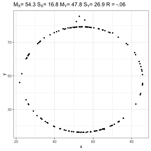 class: center, middle, inverse, title-slide # Correlations --- ## Recap Correlations are: - Standardized covariances + Range from -1 to 1 - an effect size + Measure of the strength of association between two continuous variables - Calculation: - Sum the cross-product of deviation scores - Divide by N-1 - Divide by the product of standard deviation scores --- ### Example Do Pulizters help newspapers keep readers? (Data from [FiveThirtyEight](https://fivethirtyeight.com/features/do-pulitzers-help-newspapers-keep-readers/)). ```r library(fivethirtyeight) data("pulitzer") head(pulitzer) ``` ``` ## newspaper circ2004 circ2013 pctchg_circ num_finals1990_2003 ## 1 USA Today 2192098 1674306 -24 1 ## 2 Wall Street Journal 2101017 2378827 13 30 ## 3 New York Times 1119027 1865318 67 55 ## 4 Los Angeles Times 983727 653868 -34 44 ## 5 Washington Post 760034 474767 -38 52 ## 6 New York Daily News 712671 516165 -28 4 ## num_finals2004_2014 num_finals1990_2014 ## 1 1 2 ## 2 20 50 ## 3 62 117 ## 4 41 85 ## 5 48 100 ## 6 2 6 ``` --- ```r x_var = pulitzer$pctchg_circ y_var = pulitzer$num_finals2004_2014 n = length(x_var) x_d = x_var - mean(x_var) y_d = y_var - mean(y_var) describe(cbind(x_var, x_d, y_var, y_d)) ``` ``` ## vars n mean sd median trimmed mad min max range skew ## x_var 1 50 -29.20 27.07 -32.50 -30.20 17.05 -100.00 67.00 167 0.49 ## x_d 2 50 0.00 27.07 -3.30 -1.00 17.05 -70.80 96.20 167 0.49 ## y_var 3 50 6.72 12.14 3.00 3.72 4.45 0.00 62.00 62 3.11 ## y_d 4 50 0.00 12.14 -3.72 -2.99 4.45 -6.72 55.28 62 3.11 ## kurtosis se ## x_var 2.83 3.83 ## x_d 2.83 3.83 ## y_var 9.61 1.72 ## y_d 9.61 1.72 ``` --- ```r # cross products x_d*y_d ``` ``` ## [1] -29.744 560.416 5317.936 -164.544 -363.264 -5.664 -48.384 -14.904 ## [9] -156.704 2.016 17.856 -4.464 126.496 36.816 -189.904 -146.624 ## [17] 25.456 -10.944 27.176 -25.024 14.336 3.976 3.776 116.416 ## [25] 65.536 404.976 -4.864 -7.224 -208.624 13.056 43.896 32.096 ## [33] 12.096 186.816 50.976 56.056 263.376 119.616 59.136 99.456 ## [41] -21.504 14.336 -61.824 -55.104 206.976 -46.784 40.176 99.456 ## [49] 40.176 -12.584 ``` ```r # sum of cross products (variation) sum(x_d*y_d) ``` ``` ## [1] 6482.2 ``` ```r # variance sum(x_d*y_d)/( n-1 ) ``` ``` ## [1] 132.2898 ``` ```r # correlation ( sum(x_d*y_d)/( n-1 ) ) / ( sd(x_var)*sd(y_var) ) ``` ``` ## [1] 0.4025279 ``` --- ```r cor(pulitzer$pctchg_circ, pulitzer$num_finals2004_2014) ``` ``` ## [1] 0.4025279 ``` ```r cor.test(pulitzer$pctchg_circ, pulitzer$num_finals2004_2014) ``` ``` ## ## Pearson's product-moment correlation ## ## data: pulitzer$pctchg_circ and pulitzer$num_finals2004_2014 ## t = 3.0465, df = 48, p-value = 0.003755 ## alternative hypothesis: true correlation is not equal to 0 ## 95 percent confidence interval: ## 0.1398493 0.6122747 ## sample estimates: ## cor ## 0.4025279 ``` _Note: `cor.test` cannot handle a null hypothesis other than 0. You'll have to calculate significance by hand if you're interested in using another null._ --- ### Recap: testing the significance of a correlation .pull-left[ If the null hypothesis is the **nil hypothesis**: - test significance using a *t*-distribution, where `$$\large t = \frac{r}{SE_r}$$` `$$\large SE_r = \sqrt{\frac{1-r^2}{N-2}}$$` `$$DF = N-2$$` ] .pull-right[ If null hypothesis is not 0 `\((\text{e.g., }H_0:\rho_{xy} = .40)\)` - Transform statistic and null using Fisher's r to Z `$$\large z^{'} = {\frac{1}{2}}ln{\frac{1+r}{1-r}}$$` `$$\large SE = \frac{1}{\sqrt{N-3}}$$` ] --- ### Example In PSY 302, the correlation between midterm exam grades and final exam grades was .56. The class size was 104. Is this statistically significant? -- ### Using t-method `$$\large SE_r = \sqrt{\frac{1-r^2}{N-2}} = \sqrt{\frac{1-.56^2}{104-2}} = 0.08$$` `$$\large t = \frac{r}{SE_r} = \frac{0.56}{0.08} = 6.83$$` --- .left-column[ Probability of getting a *t* statistic of 6.83 or greater is 0. ] <!-- --> --- ### Example In PSY 302, the correlation between midterm exam grades and final exam grades was .56. The class size was 104. Is this statistically significantly different from .40? -- `$$\large z^{'} = {\frac{1}{2}}ln{\frac{1+r}{1-r}}= {\frac{1}{2}}ln{\frac{1+0.56}{1-0.56}} = 0.63$$` `$$\large z^{'}_{H_0} = {\frac{1}{2}}ln{\frac{1+r}{1-r}}= {\frac{1}{2}}ln{\frac{1+0.4}{1-0.4}} = 0.42$$` $$ SE_z = \frac{1}{\sqrt{104-3}} = 0.1$$ --- ```r r = .56 N = 104 null = .40 zr = psych::fisherz(r) ``` ``` ## [1] 0.6328332 ``` ```r znull = psych::fisherz(null) ``` ``` ## [1] 0.4236489 ``` ```r se = 1/sqrt(N-3) ``` ``` ## [1] 0.09950372 ``` --- `$$Z_{\text{statistic}} = \frac{z'-\mu}{SE_z}=\frac{0.63-0.42}{0.1} = 2.1$$` ```r stat = (zr-znull)/se ``` ``` ## [1] 2.102276 ``` ```r pnorm(stat, lower.tail = F)*2 ``` ``` ## [1] 0.03552913 ``` --- ## Today - correlation matrices - visualizing correlations - reliability --- ## Correlation matrices Correlations are both a descriptive and an inferential statistic. As a descriptive statistic, they're useful for understanding what's going on in a larger dataset. Like we use the `summary()` or `describe()` (psych) functions to examine our dataset _before we run any infernetial tests_, we should also look at the correlation matrix. --- ```r library(psych) data(bfi) head(bfi) ``` ``` ## A1 A2 A3 A4 A5 C1 C2 C3 C4 C5 E1 E2 E3 E4 E5 N1 N2 N3 N4 N5 O1 O2 O3 O4 ## 61617 2 4 3 4 4 2 3 3 4 4 3 3 3 4 4 3 4 2 2 3 3 6 3 4 ## 61618 2 4 5 2 5 5 4 4 3 4 1 1 6 4 3 3 3 3 5 5 4 2 4 3 ## 61620 5 4 5 4 4 4 5 4 2 5 2 4 4 4 5 4 5 4 2 3 4 2 5 5 ## 61621 4 4 6 5 5 4 4 3 5 5 5 3 4 4 4 2 5 2 4 1 3 3 4 3 ## 61622 2 3 3 4 5 4 4 5 3 2 2 2 5 4 5 2 3 4 4 3 3 3 4 3 ## 61623 6 6 5 6 5 6 6 6 1 3 2 1 6 5 6 3 5 2 2 3 4 3 5 6 ## O5 gender education age ## 61617 3 1 NA 16 ## 61618 3 2 NA 18 ## 61620 2 2 NA 17 ## 61621 5 2 NA 17 ## 61622 3 1 NA 17 ## 61623 1 2 3 21 ``` --- ```r cor(bfi) ``` ``` ## A1 A2 A3 A4 A5 C1 C2 C3 C4 C5 E1 E2 E3 E4 E5 N1 N2 N3 N4 N5 O1 ## A1 1 NA NA NA NA NA NA NA NA NA NA NA NA NA NA NA NA NA NA NA NA ## A2 NA 1 NA NA NA NA NA NA NA NA NA NA NA NA NA NA 