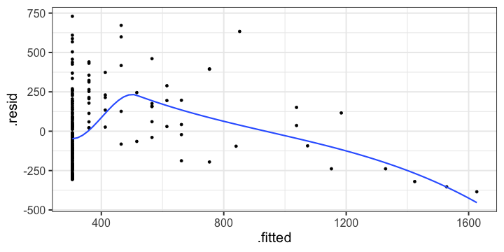class: center, middle, inverse, title-slide # Polynomials and Bootstrapping --- class: inverse ## Non-linear relationships Linear lines often make bad predictions -- very few processes that we study actually have linear relationships. For example, effort had diminishing returns (e.g., log functions), or small advantages early in life can have significant effects on mid-life outcones (e.g., exponentional functions). In cases where the direction of the effect is constant but changing in magnitude, the best way to handle the data is to transform a variable (usually the outcome) and run linear analyses. ```r log_y = ln(y) lm(log_y ~ x) ``` --- ## Polynomial relationships Other processes represent changes in the directon of relationship -- for example, it is believed that a small amount of anxiety is benefitial for performance on some tasks (positive direction) but too much is detrimental (negative direction). When the shape of the effect includes change(s) in direction, then a polynomial term(s) may be more appropriate. It should be noted that polynomials are often a poor approximation for a non-linear effect of X on Y. However, correctly testing for non-linear effects usually requires (a) a lot of data and (b) making a number of assumptions about the data. Polynomial regression can be a useful tool for exploratory analysis and in cases when data are limited in terms of quantity and/or quality. --- ## Polynomial regression Polynomial regression is most often a form of hierarchical regressoin that systematically tests a series of higher order functions for a single variable. $$ `\begin{aligned} \large \textbf{Linear: } \hat{Y} &= b_0 + b_1X \\ \large \textbf{Quadtratic: } \hat{Y} &= b_0 + b_1X + b_2X^2 \\ \large \textbf{Cubic: } \hat{Y} &= b_0 + b_1X + b_2X^2 + b_3X^3\\ \end{aligned}` $$ ---  --- ### Example Can a team have too much talent? Researchers hypothesized that teams with too many talented players have poor intrateam coordination and therefore perform worse than teams with a moderate amount of talent. To test this hypothesis, they looked at 208 international football teams. Talent was the percentage of players during the 2010 and 2014 World Cup Qualifications phases who also had contracts with elite club teams. Performance was the number of points the team earned during these same qualification phases. ```r football = read.csv("https://raw.githubusercontent.com/uopsych/psy612/master/data/swaab.csv") ``` .small[Swaab, R.I., Schaerer, M, Anicich, E.M., Ronay, R., and Galinsky, A.D. (2014). [The too-much-talent effect: Team interdependence determines when more talent is too much or not enough.](https://www8.gsb.columbia.edu/cbs-directory/sites/cbs-directory/files/publications/Too%20much%20talent%20PS.pdf) _Psychological Science 25_(8), 1581-1591.] --- .pull-left[ ```r head(football) ``` ``` ## country points talent ## 1 Spain 1485 85 ## 2 Germany 1300 76 ## 3 Brazil 1242 48 ## 4 Portugal 1189 16 ## 5 Argentina 1175 35 ## 6 Switzerland 1149 9 ``` ] .pull-right[ ```r ggplot(football, aes(x = talent, y = points)) + geom_point() + geom_smooth(se = F) + theme_bw(base_size = 20) ``` <!-- --> ] --- ```r mod1 = lm(points ~ talent, data = football) library(broom) aug1 = augment(mod1) ggplot(aug1, aes(x = .fitted, y = .resid)) + geom_point() + geom_smooth(se = F) + theme_bw(base_size = 20) ``` <!-- --> --- ```r mod2 = lm(points ~ talent + I(talent^2), data = football) summary(mod2) ``` ``` ## ## Call: ## lm(formula = points ~ talent + I(talent^2), data = football) ## ## Residuals: ## Min 1Q Median 3Q Max ## -384.66 -193.82 -35.34 152.11 729.66 ## ## Coefficients: ## Estimate Std. Error t value Pr(>|t|) ## (Intercept) 305.34402 17.62668 17.323 < 0.0000000000000002 *** ## talent 54.89787 5.46864 10.039 < 0.0000000000000002 *** ## I(talent^2) -0.57022 0.07499 -7.604 0.00000000000101 *** ## --- ## Signif. codes: 0 '***' 0.001 '**' 0.01 '*' 0.05 '.' 0.1 ' ' 1 ## ## Residual standard error: 236.3 on 205 degrees of freedom ## Multiple R-squared: 0.4644, Adjusted R-squared: 0.4592 ## F-statistic: 88.87 on 2 and 205 DF, p-value: < 0.00000000000000022 ``` --- ```r library(sjPlot) plot_model(mod2, type = "pred", terms = c("talent")) ``` <!-- --> --- ## Interpretation The intercept is the predicted value of Y when x = 0 -- this is always the interpretation of the intercept, no matter what kind of regression model you're running. The `\(b_1\)` coefficient is the tangent to the curve when X=0. In other words, this is the rate of change when X is equal to 0. If 0 is not a meaningful value on your X, you may want to center, as this will tell you the rate of change at the mean of X. ```r football$talent_c50 = football$talent - 50 mod2_50 = lm(points ~ talent_c50 + I(talent_c50^2), data = football) ``` --- ```r summary(mod2_50) ``` ``` ## ## Call: ## lm(formula = points ~ talent_c50 + I(talent_c50^2), data = football) ## ## Residuals: ## Min 1Q Median 3Q Max ## -384.66 -193.82 -35.34 152.11 729.66 ## ## Coefficients: ## Estimate Std. Error t value Pr(>|t|) ## (Intercept) 1624.68872 97.18998 16.717 < 0.0000000000000002 *** ## talent_c50 -2.12408 2.56568 -0.828 0.409 ## I(talent_c50^2) -0.57022 0.07499 -7.604 0.00000000000101 *** ## --- ## Signif. codes: 0 '***' 0.001 '**' 0.01 '*' 0.05 '.' 0.1 ' ' 1 ## ## Residual standard error: 236.3 on 205 degrees of freedom ## Multiple R-squared: 0.4644, Adjusted R-squared: 0.4592 ## F-statistic: 88.87 on 2 and 205 DF, p-value: < 0.00000000000000022 ``` --- <!-- --> --- Or you can choose another value to center your predictor on, if there's a value that has a particular meaning or interpretation. ```r football$talent_c = football$talent - mean(football$talent) mod2_c = lm(points ~ talent_c + I(talent_c^2), data = football) ``` --- ```r mean(football$talent) ``` ``` ## [1] 3.216346 ``` ```r summary(mod2_c) ``` ``` ## ## Call: ## lm(formula = points ~ talent_c + I(talent_c^2), data = football) ## ## Residuals: ## Min 1Q Median 3Q Max ## -384.66 -193.82 -35.34 152.11 729.66 ## ## 