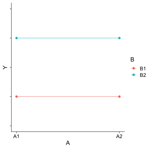 class: center, middle, inverse, title-slide # Factorial ANOVA --- class:inverse ## Factorial ANOVA The interaction of two or more categorical variables in a general linear model is formally known as .purple[Factorial ANOVA] . A factorial design is used when there is an interest in how two or more variables (or factors) affect the outcome. * Rather than conduct separate one-way ANOVAs for each factor, they are all included in one analysis. * The unique and important advantage to a factorial ANOVA over separate one-way ANOVAs is the ability to examine interactions. --- .pull-left[ The example data are from a simulated study in which 180 participants performed an eye-hand coordination task in which they were required to keep a mouse pointer on a red dot that moved in a circular motion. ] .pull-right[  ] The outcome was the time of the 10th failure. The experiment used a completely crossed, 3 x 3 factorial design. One factor was dot speed: .5, 1, or 1.5 revolutions per second. The second factor was noise condition: no noise, controllable noise, and uncontrollable noise. The design was balanced. --- ### Marginal means <table class="table" style="margin-left: auto; margin-right: auto;"> <thead> <tr> <th style="text-align:left;"> Noise </th> <th style="text-align:right;"> Slow </th> <th style="text-align:right;"> Medium </th> <th style="text-align:right;"> Fast </th> <th style="text-align:right;"> Marginal </th> </tr> </thead> <tbody> <tr grouplength="3"><td colspan="5" style="border-bottom: 1px solid;"><strong></strong></td></tr> <tr> <td style="text-align:left;padding-left: 2em;" indentlevel="1"> None </td> <td style="text-align:right;"> 630.72 </td> <td style="text-align:right;"> 525.29 </td> <td style="text-align:right;"> 329.28 </td> <td style="text-align:right;"> 495.10 </td> </tr> <tr> <td style="text-align:left;padding-left: 2em;" indentlevel="1"> Controllable </td> <td style="text-align:right;"> 576.67 </td> <td style="text-align:right;"> 492.72 </td> <td style="text-align:right;"> 287.23 </td> <td style="text-align:right;"> 452.21 </td> </tr> <tr> <td style="text-align:left;padding-left: 2em;" indentlevel="1"> Uncontrollable </td> <td style="text-align:right;"> 594.44 </td> <td style="text-align:right;"> 304.62 </td> <td style="text-align:right;"> 268.16 </td> <td style="text-align:right;"> 389.08 </td> </tr> <tr> <td style="text-align:left;font-weight: bold;color: white !important;background-color: #562457 !important;"> Marginal </td> <td style="text-align:right;font-weight: bold;color: white !important;background-color: #562457 !important;"> 600.61 </td> <td style="text-align:right;font-weight: bold;color: white !important;background-color: #562457 !important;"> 440.88 </td> <td style="text-align:right;font-weight: bold;color: white !important;background-color: #562457 !important;"> 294.89 </td> <td style="text-align:right;font-weight: bold;color: white !important;background-color: #562457 !important;"> 445.46 </td> </tr> </tbody> </table> Regardless of noise condition, does speed of the moving dot affect performance? --- ### Marginal means <table class="table" style="margin-left: auto; margin-right: auto;"> <thead> <tr> <th style="text-align:left;"> Noise </th> <th style="text-align:right;"> Slow </th> <th style="text-align:right;"> Medium </th> <th style="text-align:right;"> Fast </th> <th style="text-align:right;"> Marginal </th> </tr> </thead> <tbody> <tr grouplength="3"><td colspan="5" style="border-bottom: 1px solid;"><strong></strong></td></tr> <tr> <td style="text-align:left;padding-left: 2em;" indentlevel="1"> None </td> <td style="text-align:right;"> 630.72 </td> <td style="text-align:right;"> 525.29 </td> <td style="text-align:right;"> 329.28 </td> <td style="text-align:right;font-weight: bold;color: white !important;background-color: #562457 !important;"> 495.10 </td> </tr> <tr> <td style="text-align:left;padding-left: 2em;" indentlevel="1"> Controllable </td> <td style="text-align:right;"> 576.67 </td> <td style="text-align:right;"> 492.72 </td> <td style="text-align:right;"> 287.23 </td> <td style="text-align:right;font-weight: bold;color: white !important;background-color: #562457 !important;"> 452.21 </td> </tr> <tr> <td style="text-align:left;padding-left: 2em;" indentlevel="1"> Uncontrollable </td> <td style="text-align:right;"> 594.44 </td> <td style="text-align:right;"> 304.62 </td> <td style="text-align:right;"> 268.16 </td> <td style="text-align:right;font-weight: bold;color: white !important;background-color: #562457 !important;"> 389.08 </td> </tr> <tr> <td style="text-align:left;"> Marginal </td> <td style="text-align:right;"> 600.61 </td> <td style="text-align:right;"> 440.88 </td> <td style="text-align:right;"> 294.89 </td> <td style="text-align:right;font-weight: bold;color: white !important;background-color: #562457 !important;"> 445.46 </td> </tr> </tbody> </table> Regardless of dot speed, does noise condition affect performance? --- ### Marginal means <table class="table" style="margin-left: auto; margin-right: auto;"> <thead> <tr> <th style="text-align:left;"> Noise </th> <th style="text-align:right;"> Slow </th> <th style="text-align:right;"> Medium </th> <th style="text-align:right;"> Fast </th> <th style="text-align:right;"> Marginal </th> </tr> </thead> <tbody> <tr grouplength="3"><td colspan="5" style="border-bottom: 1px solid;"><strong></strong></td></tr> <tr> <td style="text-align:left;padding-left: 2em;" indentlevel="1"> None </td> <td style="text-align:right;"> 630.72 </td> <td style="text-align:right;"> 525.29 </td> <td style="text-align:right;"> 329.28 </td> <td style="text-align:right;"> 495.10 </td> </tr> <tr> <td style="text-align:left;padding-left: 2em;" indentlevel="1"> Controllable </td> <td style="text-align:right;"> 576.67 </td> <td style="text-align:right;"> 492.72 </td> <td style="text-align:right;"> 287.23 </td> <td style="text-align:right;"> 452.21 </td> </tr> <tr> <td style="text-align:left;padding-left: 2em;" indentlevel="1"> 