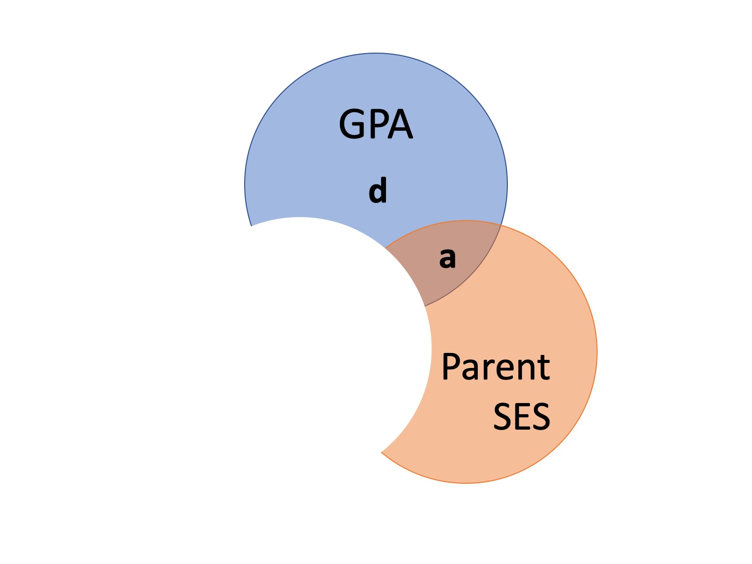 class: center, middle, inverse, title-slide # Partial correlations --- ## Annoucements * Homework due on Friday * No matrix algebra (enjoy with Elliot) --- ## Today - path diagrams - partial and semi-partial correlations --- ## Causal relationships Does parent socioeconomic status *cause* better grades? * `\(r_{\text{GPA},\text{SES}} = .33\)` -- Potential confound: Peer relationships - `\(r_{\text{SES}, \text{peer}} = .29\)` - `\(r_{\text{GPA}, \text{peer}} = .37\)` ??? Don't know how variables are related, only know that they are in a perfect world, we would want to **hold constant** peer relationships - control for - partial out --- ### Does parent SES cause better grades?  --- ### spurious relationship  --- ### indirect (mediation)  --- ### interaction (moderation)  --- ### multiple causes  --- ### direct and indirect effects  --- ### multiple causes  ??? This is the model implied by multiple regression models. --- ## General regression model `$$\large \hat{Y} = b_0 + b_1X_1 + b_2X_2 + \dots+b_kX_k$$` This is ultimately where we want to go. Unfortunately, it's not as simply as multiplying the correlation between Y and each X by the ratio of their standard errors and stringing them together. Why? --- ## What is `\(R^2\)`? .pull-left[  ] .pull-right[ `$$\large R^2 = \frac{s^2_{\hat{Y}}}{s^2_Y}$$` `$$\large = \frac{SS_{\text{Regression}}}{SS_Y}$$` ] ---  ### What is `\(R^2\)`? ---  ---  --- ### What is `\(R^2\)`?  --- ### Types of correlations Pearson product moment correlation - Zero-order correlation - Only two variables are X and Y -- Semi-partial correlation - This correlation assess the extent to which the part of `\(X_1\)` *that is independent of* of `\(X_2\)` correlates with all of `\(Y\)` - This is often the estimate that we refer to when we talk about .purple[controlling for] another variable. ---  ??? the semi-partial correlation between parent SES and GPA controlling for peer relationships is a (not c), divided by all of GPA --- ### Semi-partial correlations `$$\large sr_1 = r_{Y(1.2)} = \frac{r_{Y1}-r_{Y2}r_{12}}{\sqrt{1-r^2_{12}}}$$` `$$\large sr_1^2 = R^2_{Y.12}-r^2_{Y2}$$` **Terms** `\(R_{Y.12}\)` -- The correlation of Y with the (best) linear combination of X1 and X2. `\(r_{Y(1.2)}\)` -- the semi-partial correlation of Y with X1 controlling for X2 --- ### Types of correlations Pearson product moment correlation - Zero-order correlation - Only two variables are X and Y Semi-partial correlation - This correlation assess the extent to which the part of `\(X_1\)` *that is independent of* of `\(X_2\)` correlates with all of Y - This is often the estimate that we refer to when we talk about **controlling for** another variable. -- Partial correlation - The extent to which the part of `\(X_1\)` that is independent of `\(X_2\)` is correlated with the part of `\(Y\)` that is also independent of `\(X_2\)`. ---  ---  --- ### Partial correlations `$$\large pr_1=r_{Y1.2} = \frac{r_{Y1}-r_{Y2}r_{{12}}}{\sqrt{1-r^2_{Y2}}\sqrt{1-r^2_{12}}} = \frac{r_{Y(1.2)}}{\sqrt{1-r^2_{Y2}}}$$` **Terms** `\(R_{Y.12}\)` -- The correlation of Y with the (best) linear combination of X1 and X2. `\(r_{Y(1.2)}\)` -- the semi-partial correlation of Y with X1 controlling for X2 `\(r_{Y1.2}\)` -- the partial correlation of Y with X1 controlling for X2 --- ### What happens if `\(X_1\)` and `\(X_2\)` are uncorrelated? How does the semi-partial correlation compare to the zero-order correlation? -- `$$\large r_{Y(1.2)} = r_{Y1}$$` How does the partial correlation compare to the zero-order correlation? -- `$$\large r_{Y1.2} \neq r_{Y1}$$` --- ## When we use these? The semi-partial correlation is most often used when we want to show that some variable `\(Z\)` adds incremental variance in `\(Y\)` .purple[above and beyond] another `\(X\)` variable. - e.g., does nutrition predict Alzheimer's above and beyond known predictors like age, gender, and self-rated health? The partial correlations most often used when some .purple[third variable], `\(Z\)`, is a plausible explanation of the correlation between `\(X\)` and `\(Y\)` - e.g., can the relationship between ice cream and murder be explained by temperature? --- ## Example We'll use a dataset containing three variables: happiness, extraversion, and social support. There's some evidence that individuals high in extraversion experience more happiness. Is this because they receive more social support? If so, then the correlation between extraversion and happiness will be close to zero after accounting for social support. ```r library(here) data = read.csv(here("data/happy.csv")) ``` --- ```r data[,c("Extraversion", "Happiness", "SocSup")] %>% cor %>% round(3) ``` ``` ## Extraversion Happiness SocSup ## Extraversion 1.000 0.559 0.441 ## Happiness 0.559 1.000 0.445 ## SocSup 0.441 0.445 1.000 ``` The zero-order correlation between Happiness and Extraversion is 0.559 ```r library(ppcor) spcor.test(data$Happiness, # Y data$Extraversion, # X1 data$SocSup) # X2 ``` ``` ## estimate p.value statistic n gp Method ## 1 0.4040325 4.252627e-07 5.300267 147 1 pearson ``` The semi-partial correlation between Happiness and Extraversion is 0.404 --- ```r data[,c("Extraversion", "Happiness", "SocSup")] %>% cor %>% round(3) ``` ``` ## Extraversion Happiness SocSup ## Extraversion 1.000 0.559 0.441 ## Happiness 0.559 1.000 0.445 ## SocSup 0.441 0.445 1.000 ``` The zero-order correlation between Happiness and Extraversion is 0.559 ```r library(ppcor) pcor.test(data$Happiness, # Y data$Extraversion, # X1 data$SocSup) # X2 ``` ``` ## estimate p.value statistic n gp Method ## 1 0.4512658 1.087597e-08 6.068191 147 1 pearson ``` The partial correlation between Happiness and Extraversion is 0.451 --- ## `\(r_{(Y1.2)}\)` and `\(r_{Y1.2}\)` are correlations of residuals Recall that the residuals of a univariate regression equation are the part of the outcome `\((Y)\)` that is independent of the predictor `\((X)\)`. `$$\Large \hat{Y} = b_0 + b_1X$$` `$$\Large e_i = Y_i - \hat{Y_i}$$` We can use this to