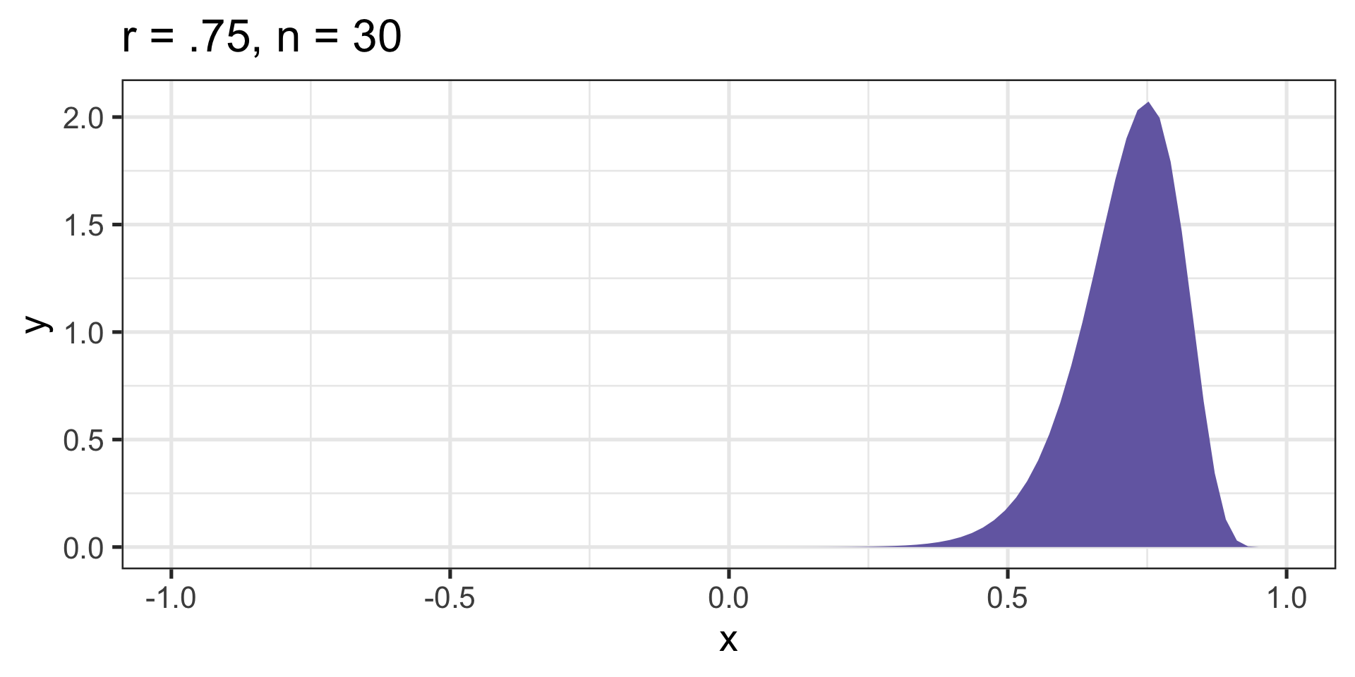 If we want to make calculations around correlation values that are not equal to 0, then we will run into a skewed sampling distribution. This applies to both calculating confidence intervals around estimates of correlations and null hypotheses in which \(\rho \neq 0\).