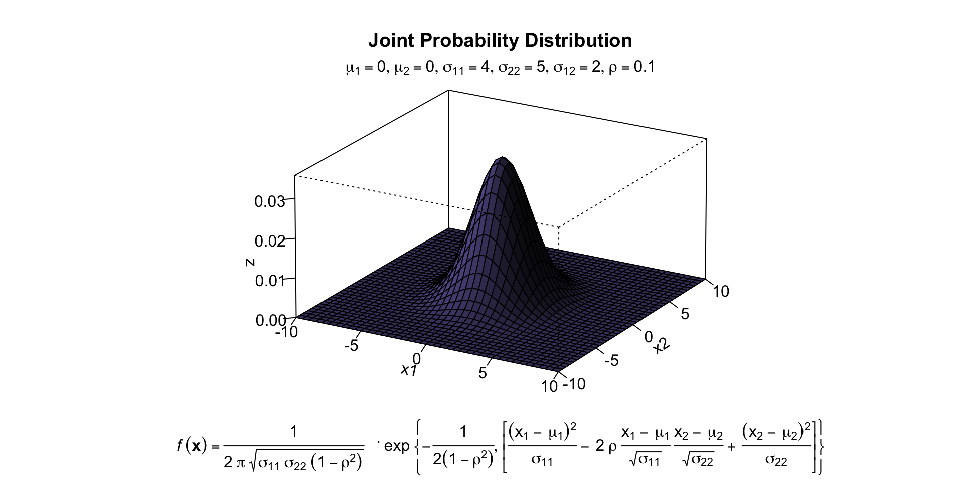 main="Joint Probability Distribution", sub=expression(italic(f)~(bold(x))==frac(1,2~pi~sqrt(sigma[11]~ sigma[22]~(1-rho^2)))~phantom(0)^bold(.)~exp~bgroup("{", list(-frac(1,2(1-rho^2)),