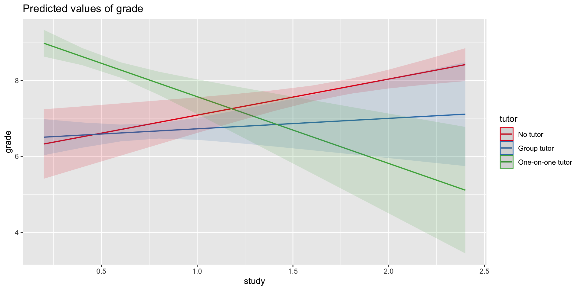 \[\hat{\text{grade}} = b_{0} + b_{1}\text{Tutor} + b_2\text{Study} + b_3(\text{Tutor}\times\text{Study})\]