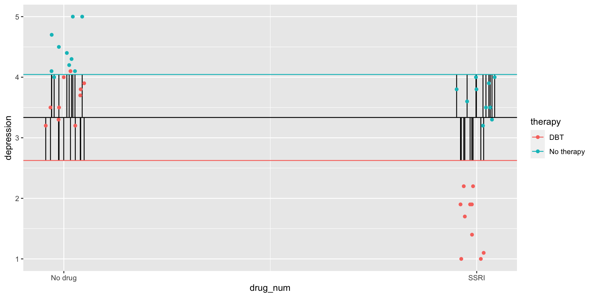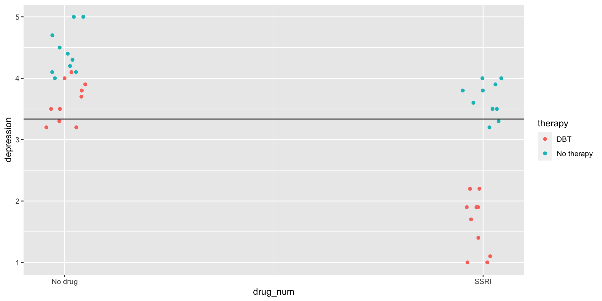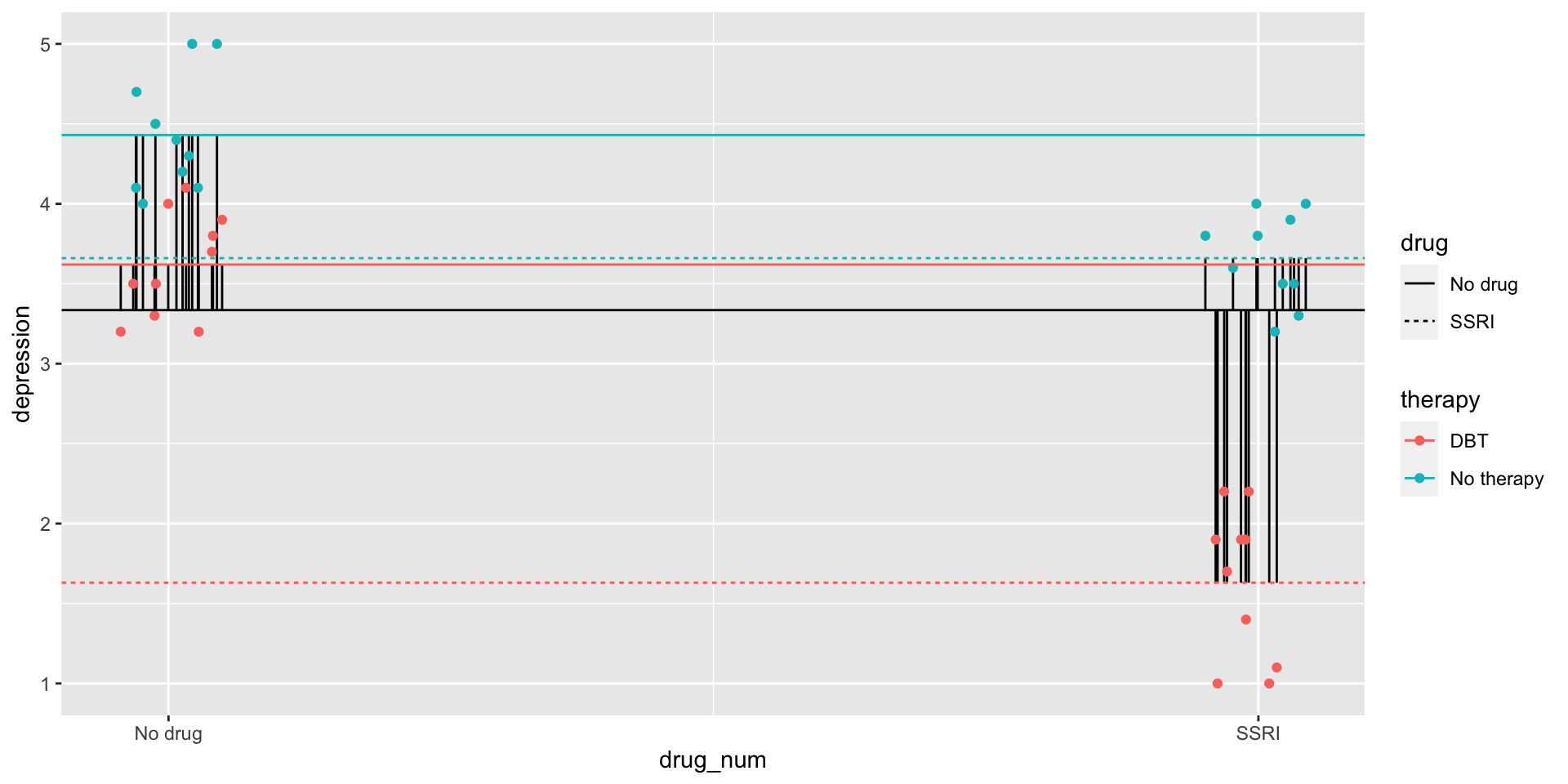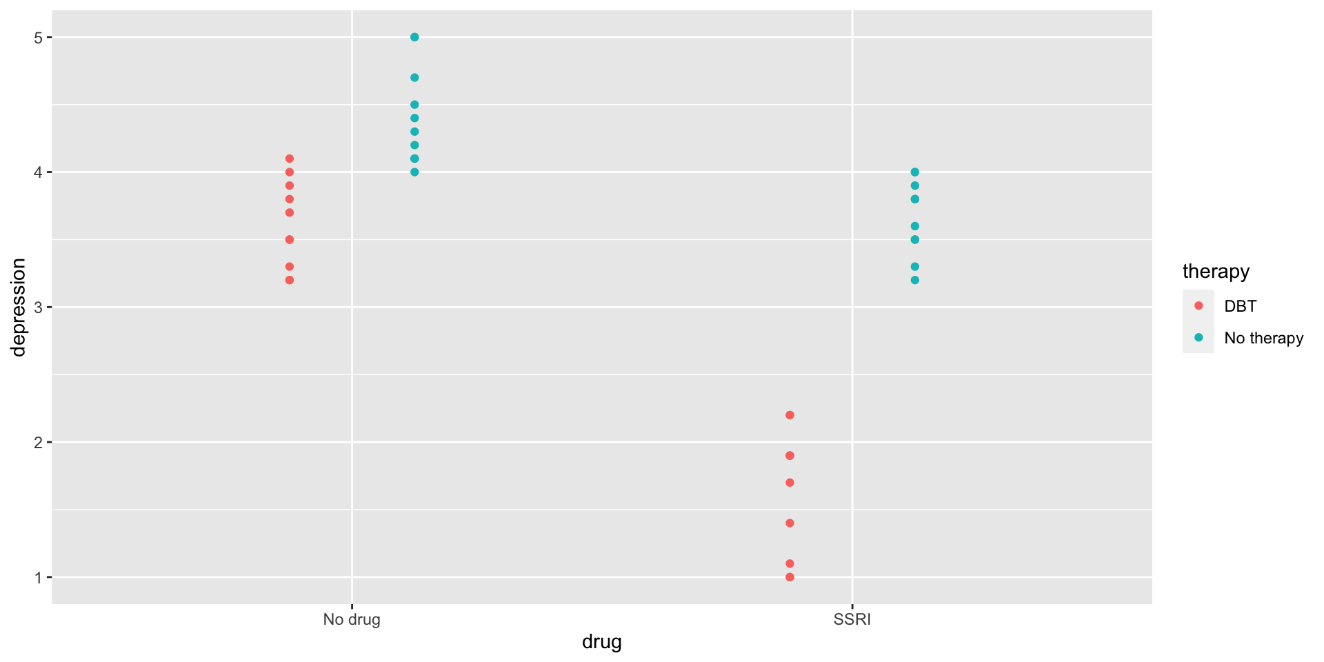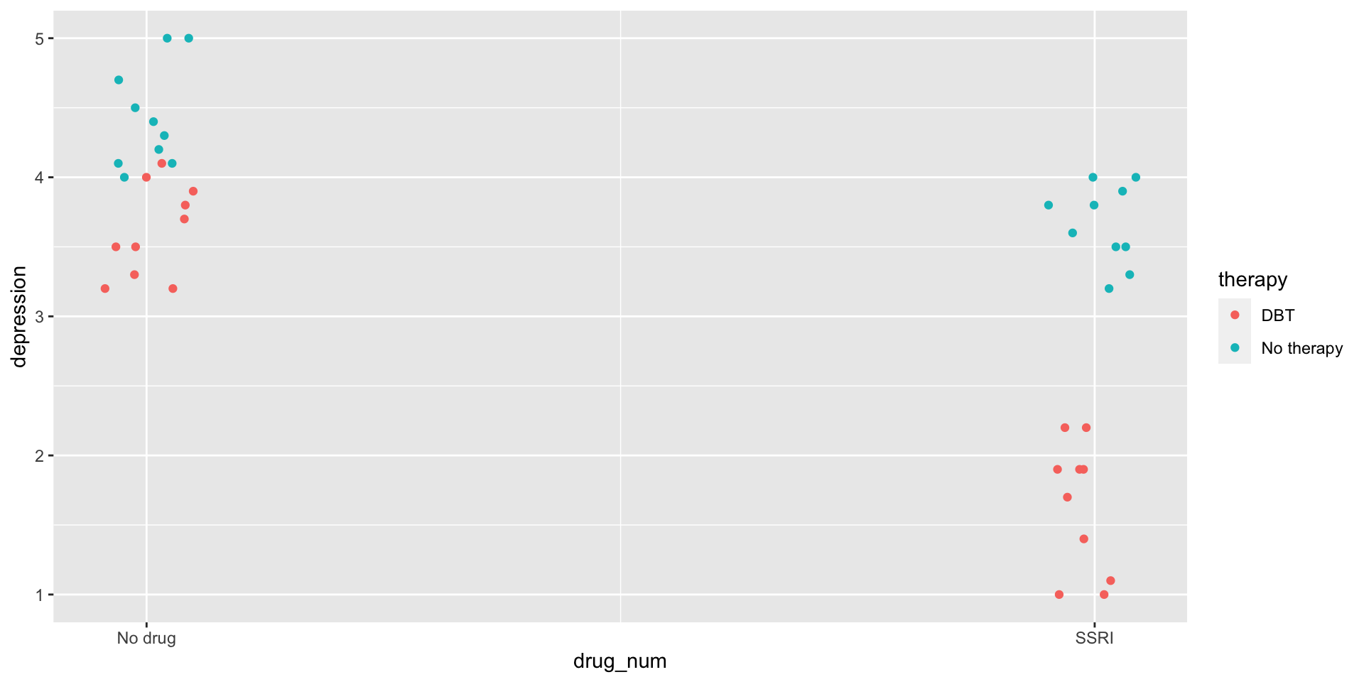 Hypothetical data on the combined efficacy of SSRIs and DBT.